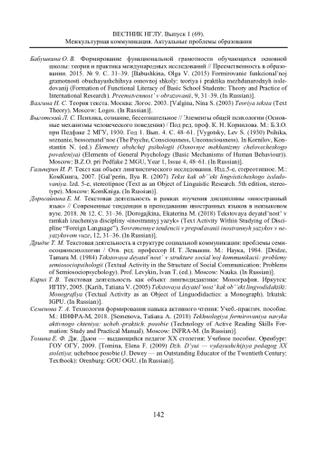 9. Карих Т. В. Текстовая деятельность как объект лингводидактики: Монография. Иркутск: ИГПУ, 2005. [Karih, Tatiana V. (2005) Tekstovaya deyatel’nost’ kak ob’‘ekt lingvodidaktiki: Monografiya (Textual Activity as an Object of Linguodidactics: a Monograph). Irkutsk: IGPU. (In Russian)].
