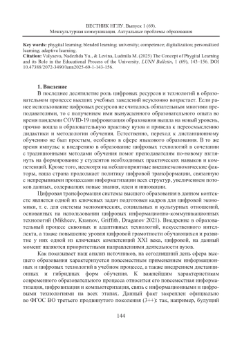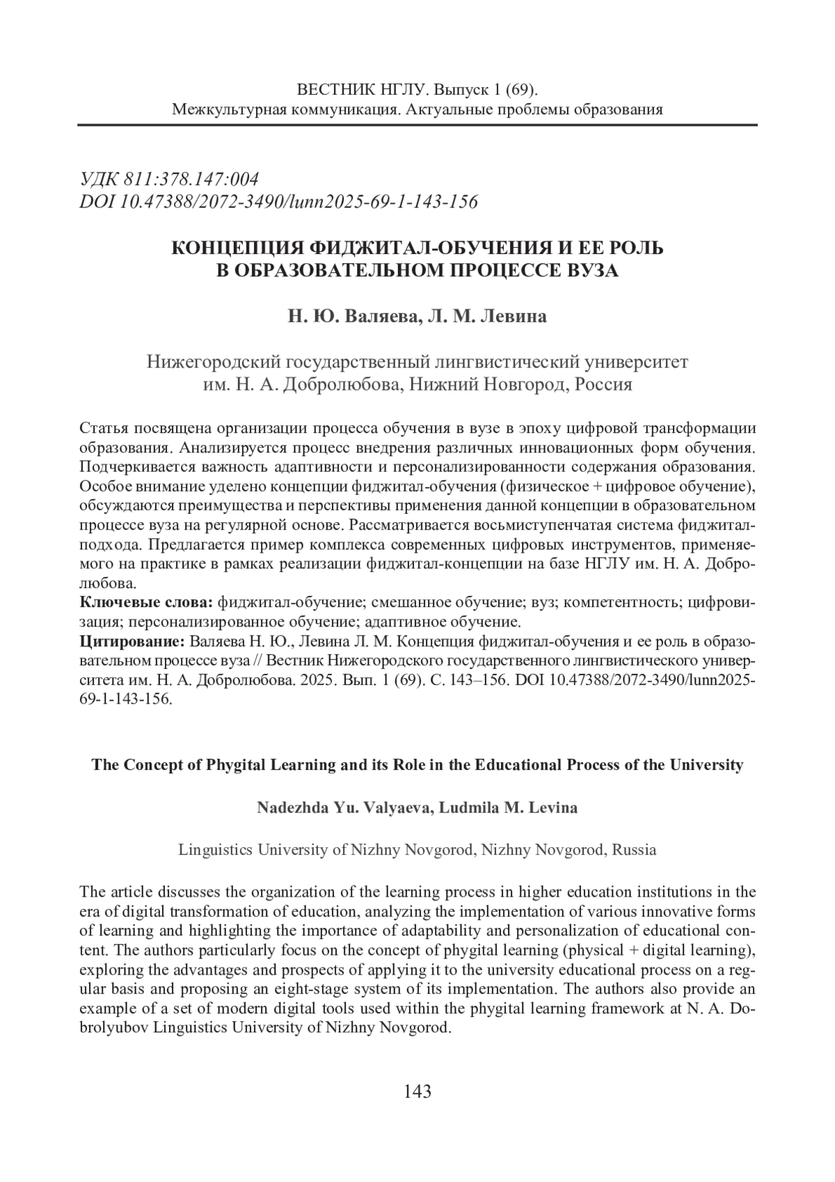 Статья посвящена организации процесса обучения в вузе в эпоху цифровой трансформации образования. Анализируется процесс внедрения различных инновационных форм обучения. Подчеркивается важность адаптивности и персонализированности содержания образования. Особое внимание уделено концепции фиджитал-обучения (физическое + цифровое обучение), обсуждаются преимущества и перспективы применения данной концепции в образовательном процессе вуза на регулярной основе. Рассматривается восьмиступенчатая система фиджитал-подхода. Предлагается пример комплекса современных цифровых инструментов, применяемого на практике в рамках реализации фиджитал-концепции на базе НГЛУ им. Н. А. Добролюбова.