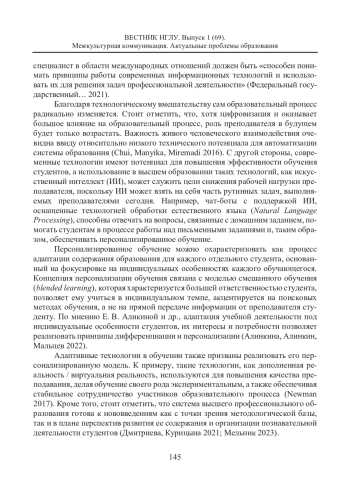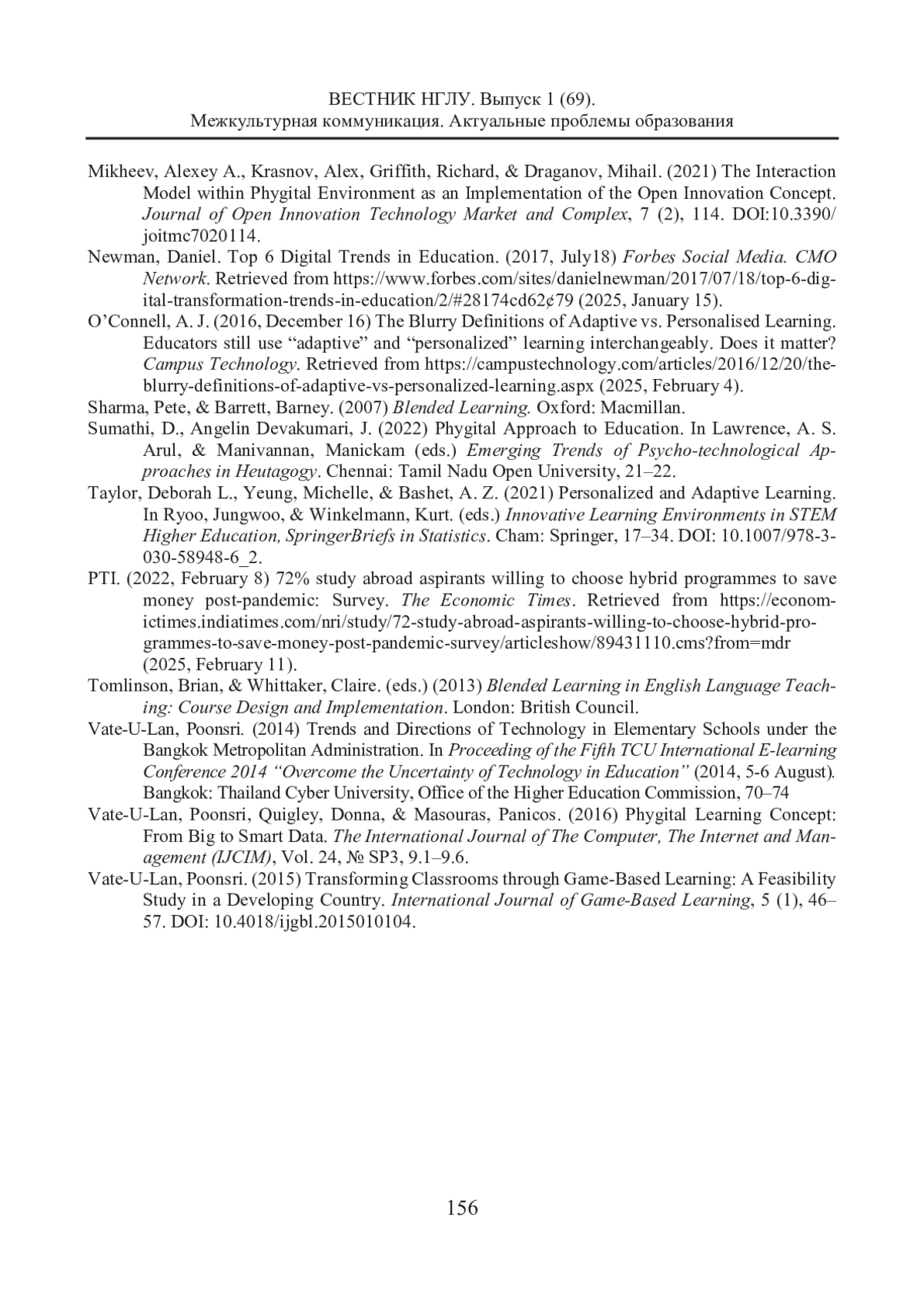 6. Лукманова О. Б., Левина Л. М. Чтение лекций по всемирной литературе в режиме распределенного университета: ограничения и возможности // Вестник Нижегородского университета им. Н. И. Лобачевского. Серия: Социальные науки. 2023. № 1 (69). С. 237-246. [Lukmanova, Olga B., & Levina, Ludmila M. (2023) Chtenie lektsij po vsemirnoy literature v rezhime raspredelyonnogo universiteta: ogranichenya i vozmozhnosti (Online Lectures in World Literature within the Framework of Hybrid / Blended Learning: Challenges, Limitations, and Opportunities). Vestnik of Lobachevsky State University of Nizhni Novgorod. Series: Social Sciences, 1 (69), 237-246 (In Russian)]. EDN: WYSTEW
