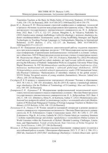 1. Аликина Е. В., Аликин М. Ю., Мальцев Д. В. Цифровая грамотность преподавателя языков и перевода как основа медиабезопасности студентов многопрофильного вуза // Вестник Нижегородского государственного лингвистического университета им. Н. А. Добролюбова. 2022. Вып. 4 (60). С. 156-170. [Alikina, Elena V., Alikin, Mikhail Yu., & Maltsev, Dmitry V. (2022) Tsifrovaya gramotnost’ prepodavatel’ya yazikov i perevoda kak osnova mediabezopastnisti studentov mnogoprofil’nogo vuza (Digital Literacy of Language and Translation Teachers as the Basis for Media Safety of University Students). LUNN Bulletin, 4 (60), 156-170. (In Russian)]. DOI: 10.47388/2072-3490/lunn2022-60-4-156-170 EDN: UACXVB