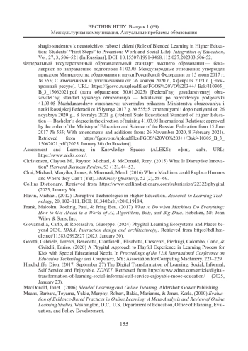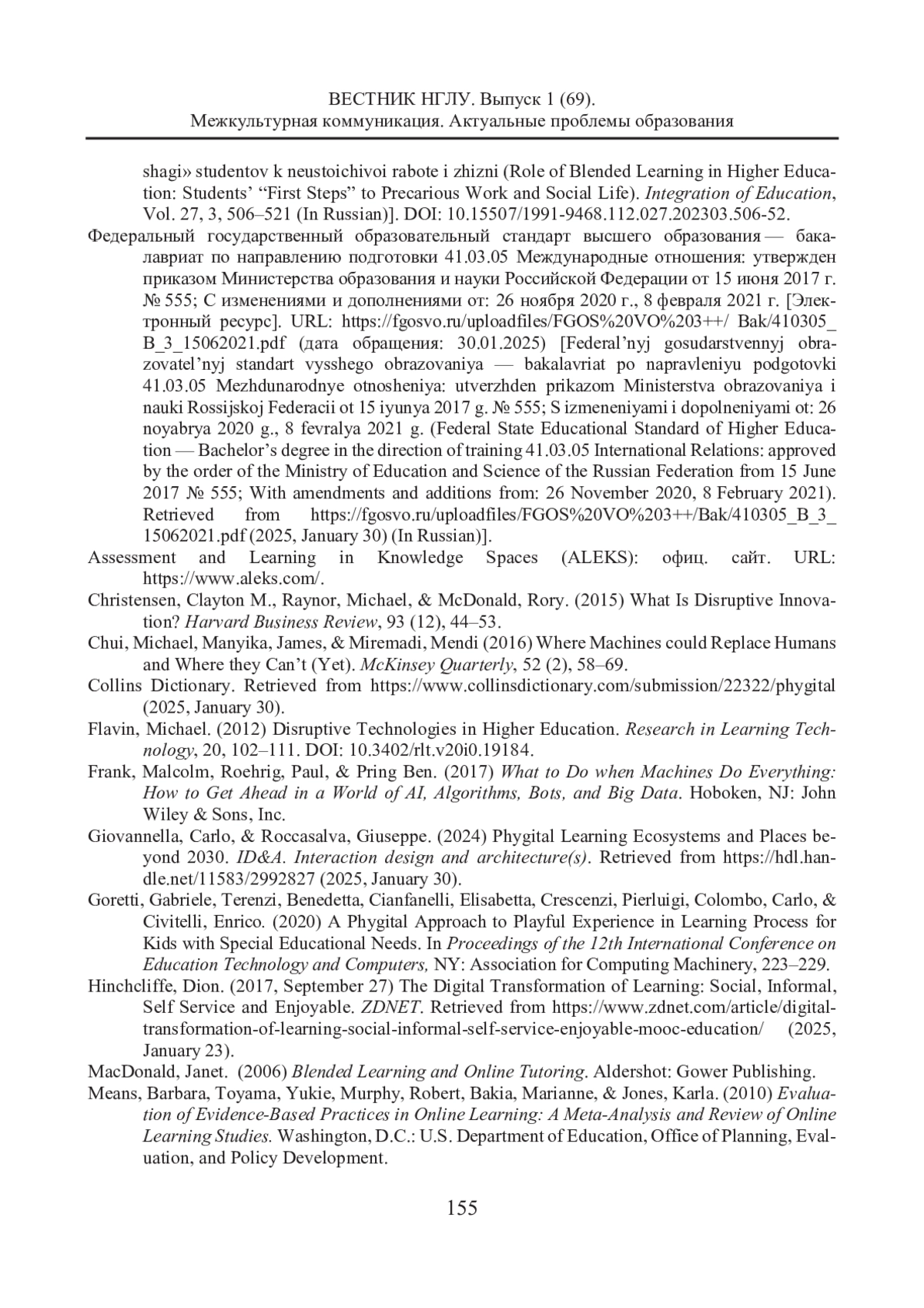 7. Мельник А. Д. Роль смешанного обучения в высшем образовании: “первые шаги” студентов к неустойчивой работе и жизни // Интеграция образования. 2023. Т. 27. № 3. С. 506-521.). [Mel’nik, Anastasia D. (2023) Rol’ smeshannogo obucheniya v visshem obrazovanii: “pervie shagi” studentov k neustoichivoi rabote i zhizni (Role of Blended Learning in Higher Education: Students’ “First Steps” to Precarious Work and Social Life). Integration of Education, Vol. 27, 3, 506-521 (In Russian)]. DOI: 10.15507/1991-9468.112.027.202303.506-52 EDN: AZESCR