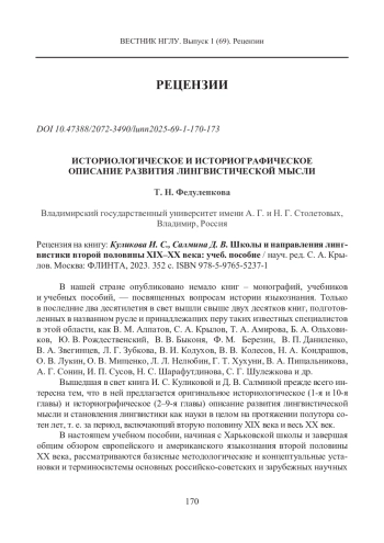 Рецензия на книгу: Куликова И. С., Салмина Д. В. Школы и направления лингвистики второй половины XIX-XX века: учеб. пособие / науч. ред. С. А. Крылов. Москва: ФЛИНТА, 2023. 352 с. ISBN 978-5-9765-5237-1