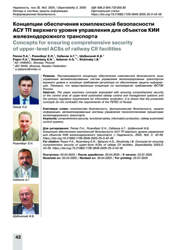 1. Комплексная безопасность АСУ ТП объектов КИИ железнодорожного транспорта / П.А. Попов, Е.Н. Розенберг, А.Г. Сабанов, И.Б. Шубинский // Надежность. 2024. № 4. С. 48-57. https://doi.org/10.21683/1729-2646-2024-24-4