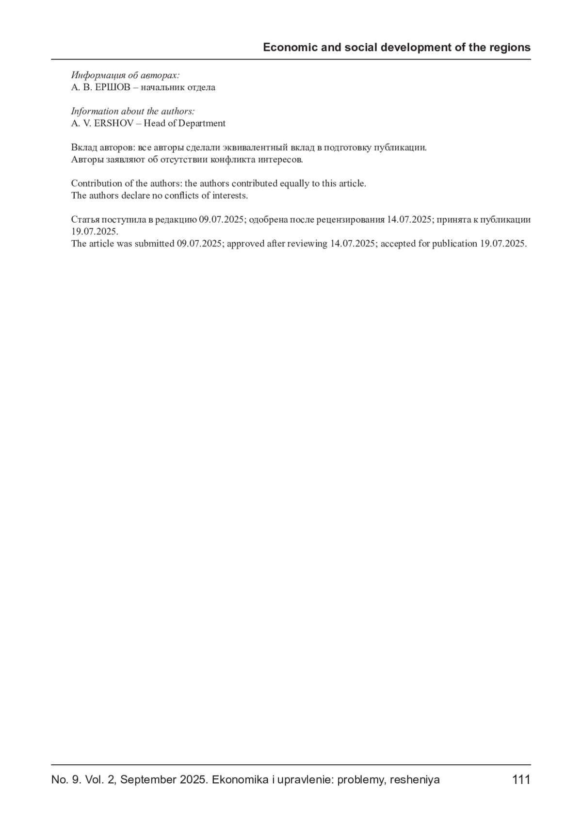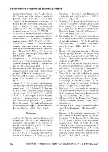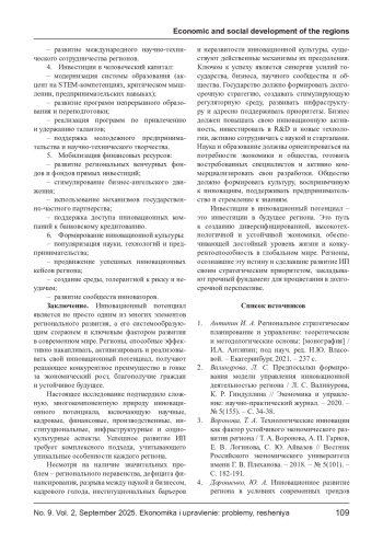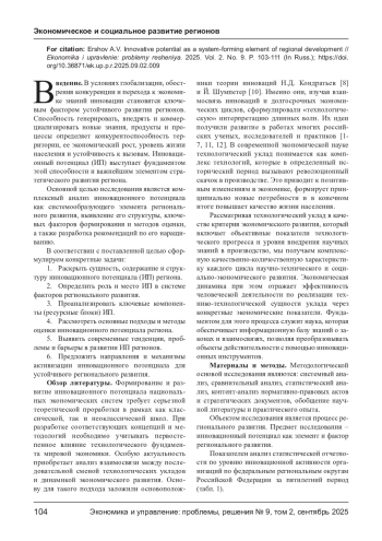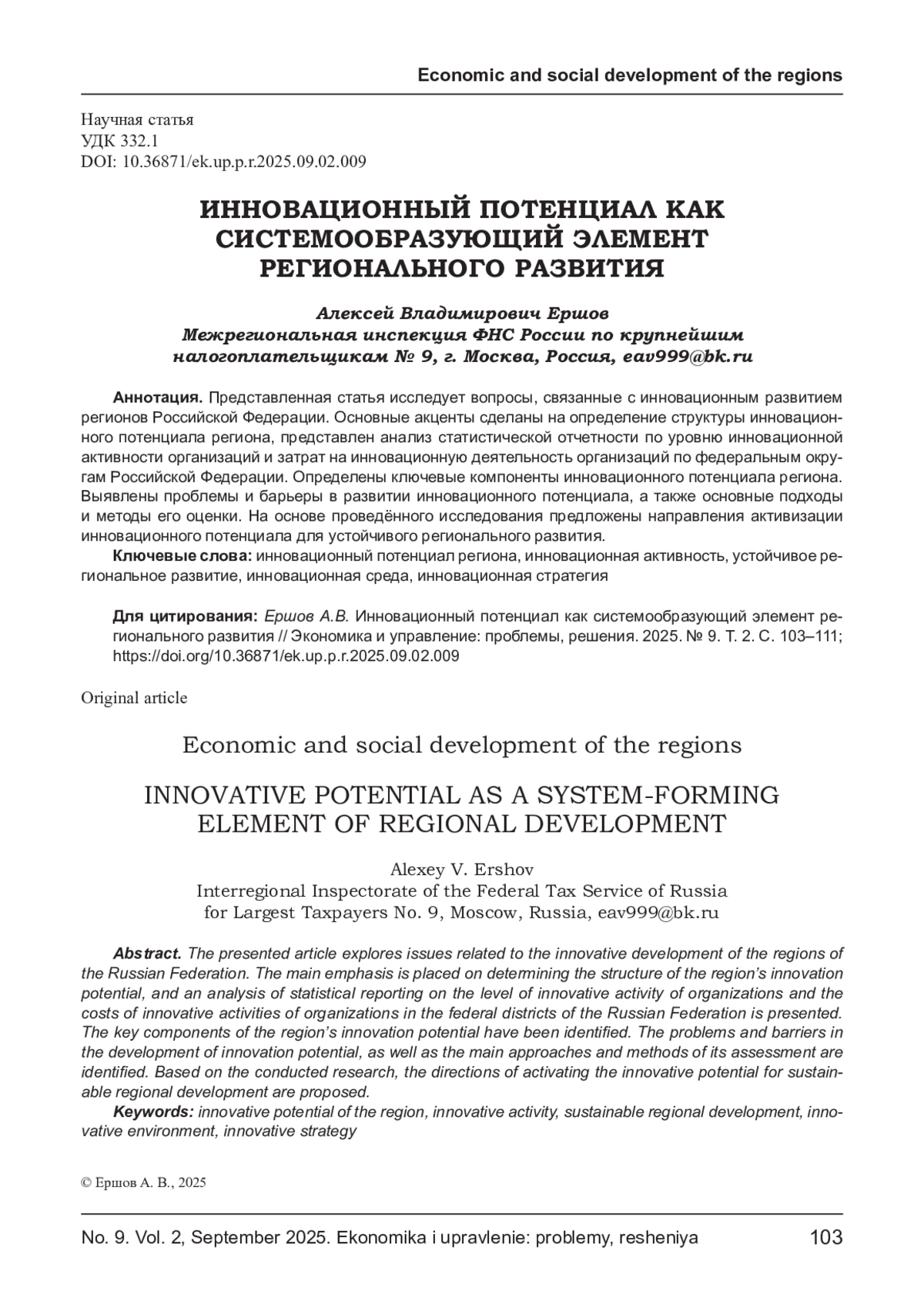 ЕРШОВ А. В. ИННОВАЦИОННЫЙ ПОТЕНЦИАЛ КАК СИСТЕМООБРАЗУЮЩИЙ ЭЛЕМЕНТ РЕГИОНАЛЬНОГО РАЗВИТИЯ // ЭКОНОМИКА И УПРАВЛЕНИЕ: ПРОБЛЕМЫ, РЕШЕНИЯ. 2025. ТОМ 2 № 9