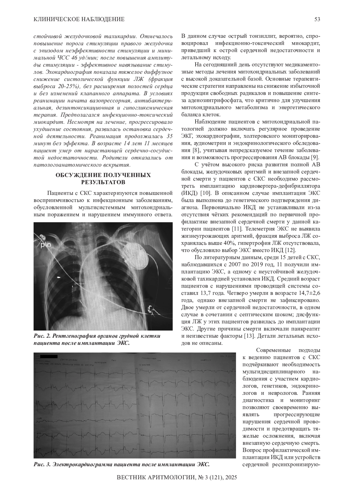 Синдром Кернса-Сейра (СКС) представляет собой редкую митохондриальную патологию, впервые описанную в 1958 году Томасом Кернсом и Джорджем Помероя Сейром в публикации «Пигментный ретинит, наружная офтальмоплегия и полная блокада сердца» [1]. Заболевание характеризуется классической триадой симптомов: дебют до 20 лет, хроническая прогрессирующая наружная офтальмоплегия и пигментная ретинопатия [2]. Существенной особенностью СКС является высокая частота нарушений проводящей системы сердца, что значительно влияет на прогноз заболевания.