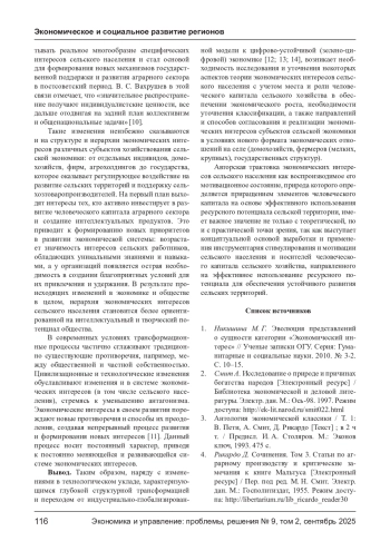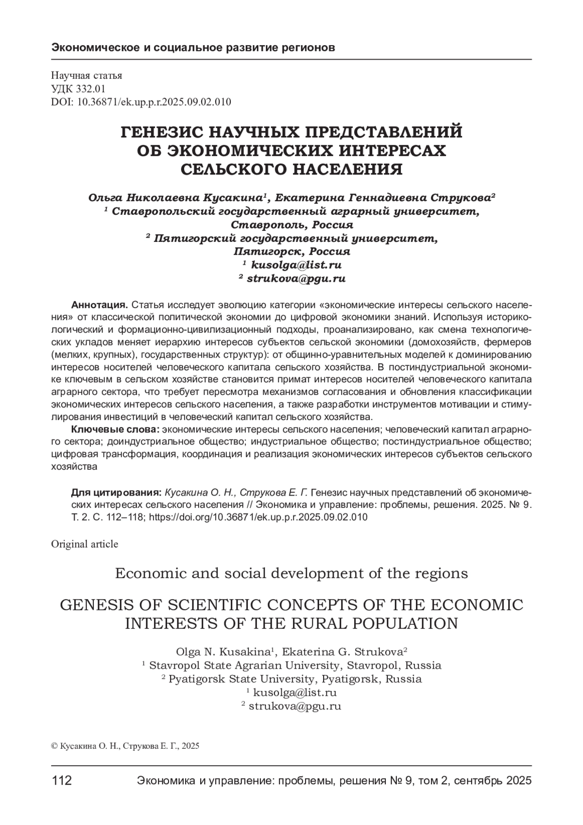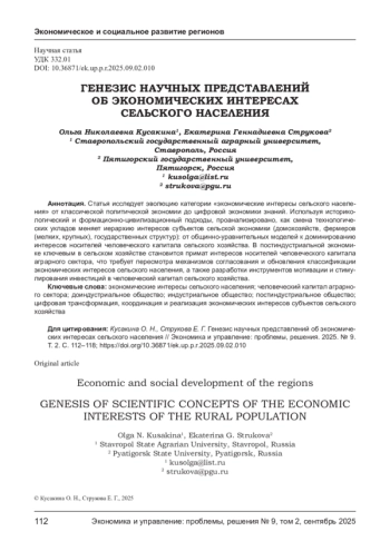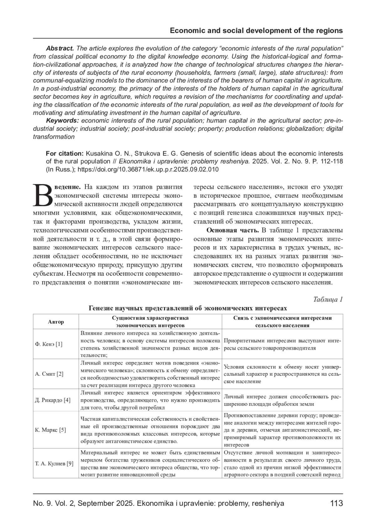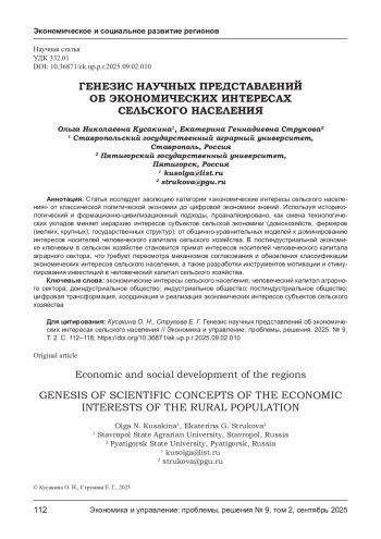КУСАКИНА О. Н., СТРУКОВА Е. Г. ГЕНЕЗИС НАУЧНЫХ ПРЕДСТАВЛЕНИЙ ОБ ЭКОНОМИЧЕСКИХ ИНТЕРЕСАХ СЕЛЬСКОГО НАСЕЛЕНИЯ // ЭКОНОМИКА И УПРАВЛЕНИЕ: ПРОБЛЕМЫ, РЕШЕНИЯ. 2025. ТОМ 2 № 9