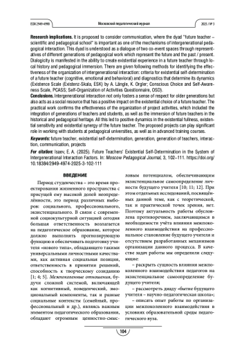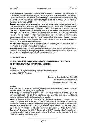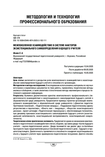 Результаты. Выявлено диалектическое единство межпоколенного профессионального (педагогического) взаимодействия и экзистенциального самоопределения будущего учителя в образовательной среде университета. Предлагаются примеры проектов организации межпоколенного взаимодействия в образовательной среде университета («Династии педагогов. Притяжение поколений», «Педагогические мемуары», «Подражание педагогическому идеалу: ретроспектива и перспектива», «Юность моя - тимуровцы», «Искусство экзистенциального рассказа», проектантикафе «Педагогическая перезагрузка»), обеспечивающие положительную динамику признаков экзистенциального самоопределения будущего учителя (экзистенциальной наполненности, экзистенциальной восприимчивости, экзистенциальной синергетичности).