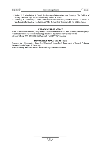 14. Becker H., Mannheims K. Problem der Generationen - 80 Jahre danach (Проблема поколений - 80 лет назад) // Journal of Family Research. 2008. № 20 (2). С. 203-221.