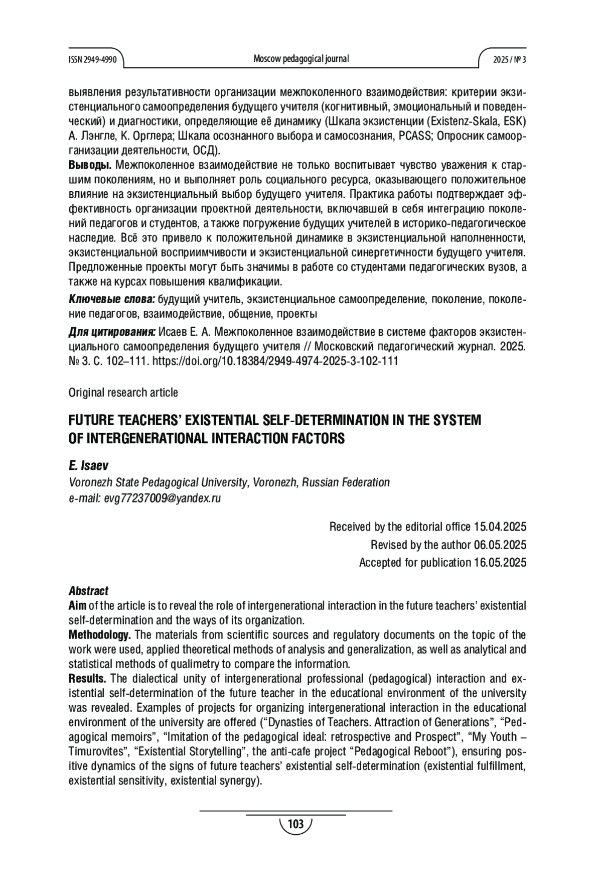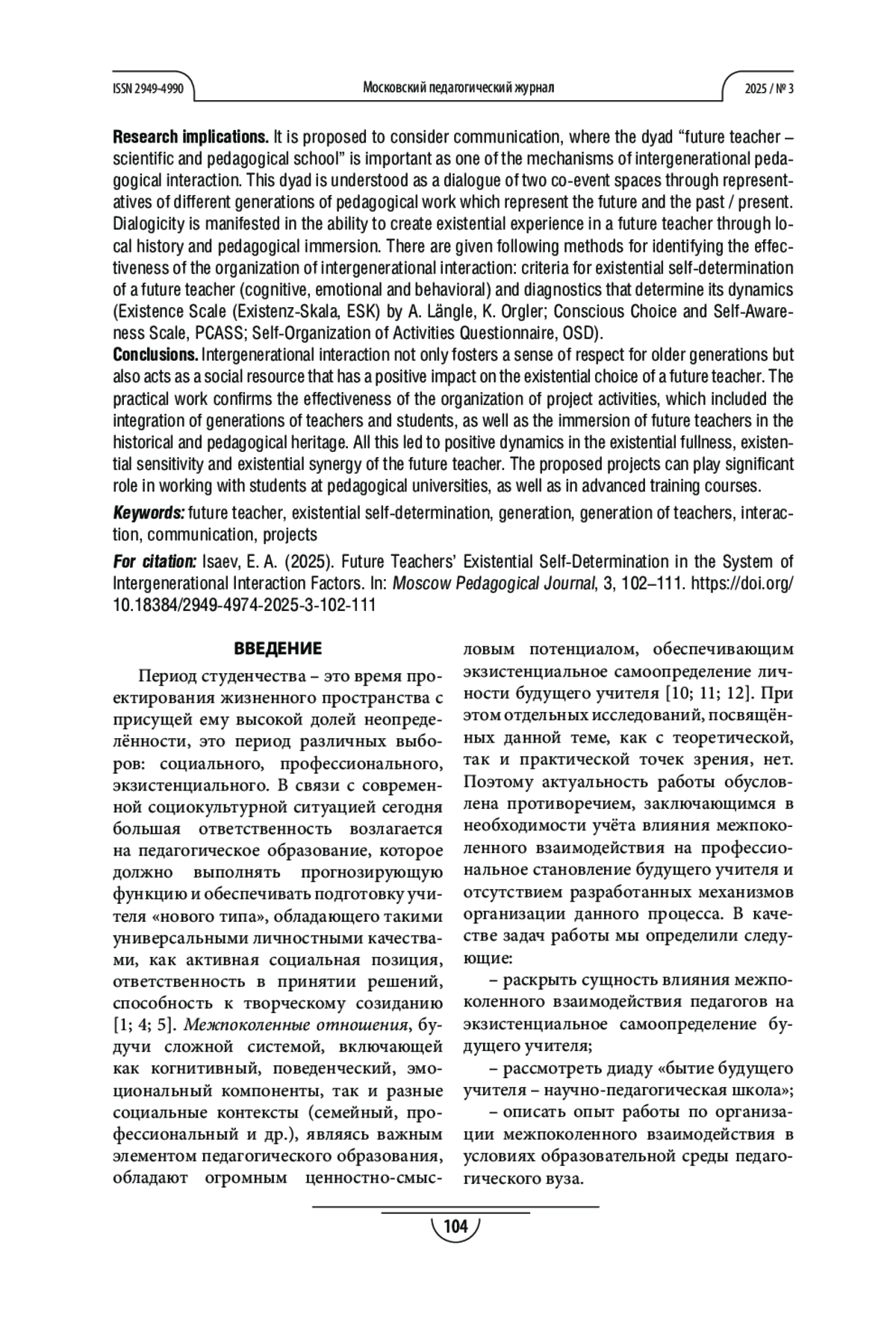 Теоретическая и/или практическая значимость. Предлагается одним из механизмов межпоколенного педагогического взаимодействия считать общение, где важна диада «бытие будущего учителя - научно-педагогическая школа». Диада понимается как диалог двух событийных пространств через представителей разных поколений педагогического дела - будущего и прошлого/настоящего. Диалогичность проявляется в способности созидания экзистенциального опыта у будущего учителя через краеведческо-педагогическое погружение. Даются способы выявления результативности организации межпоколенного взаимодействия: критерии экзистенциального самоопределения будущего учителя (когнитивный, эмоциональный и поведенческий) и диагностики, определяющие её динамику (Шкала экзистенции (Existenz-Skala, ESK) А. Лэнгле, К. Орглера; Шкала осознанного выбора и самосознания, PCASS; Опросник самоорганизации деятельности, ОСД).