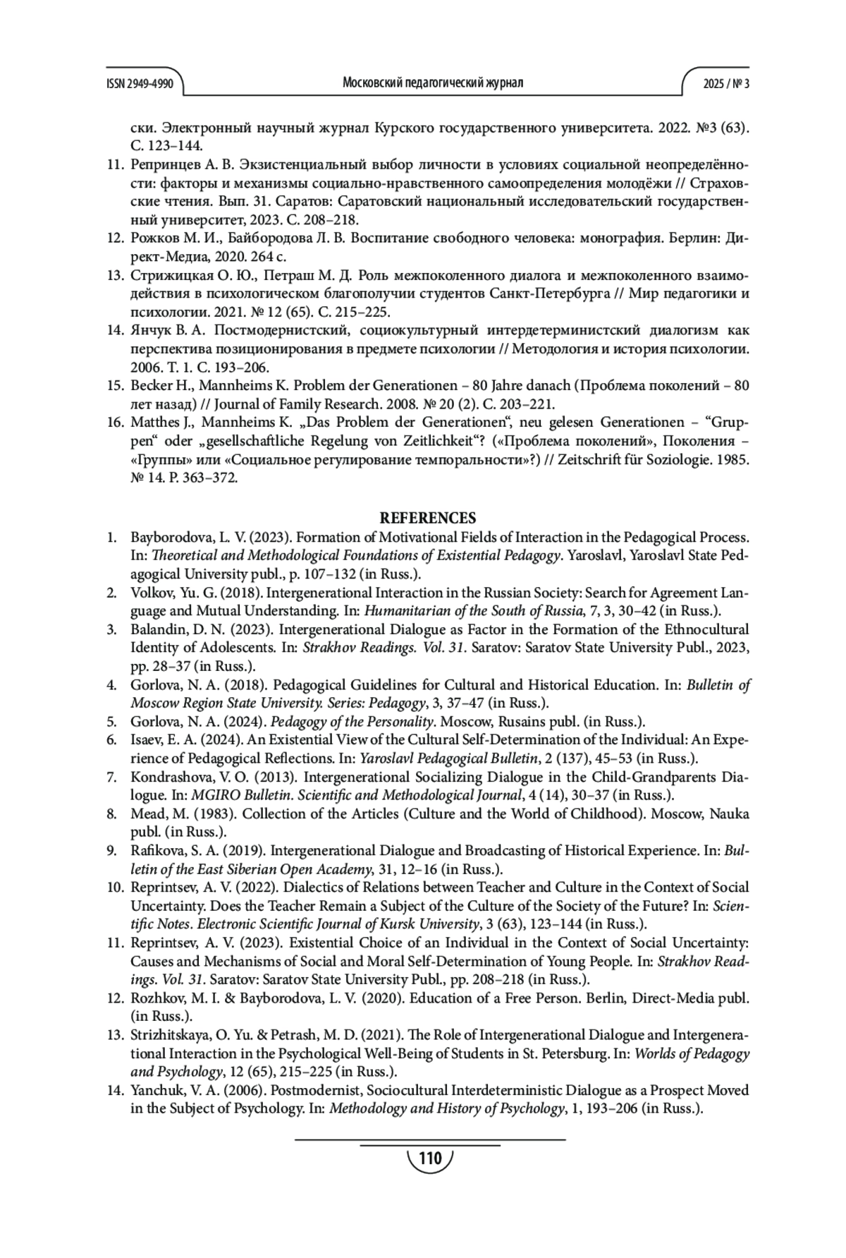 12. Стрижицкая О. Ю., Петраш М. Д. Роль межпоколенного диалога и межпоколенного взаимодействия в психологическом благополучии студентов Санкт-Петербурга // Мир педагогики и психологии. 2021. № 12 (65). С. 215-225. EDN: JGKKPV