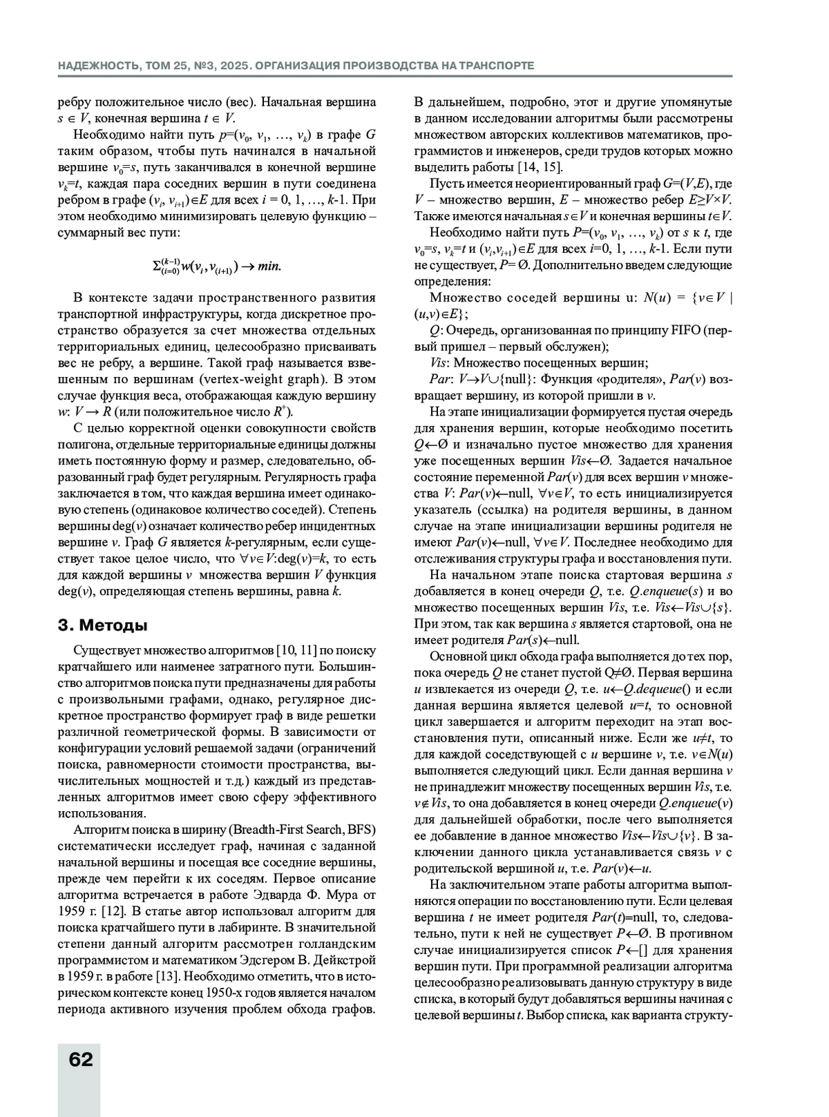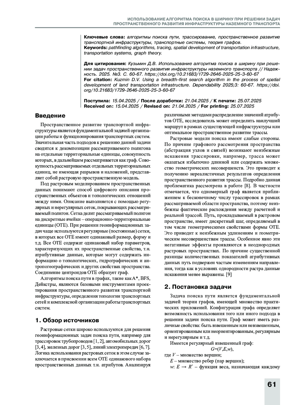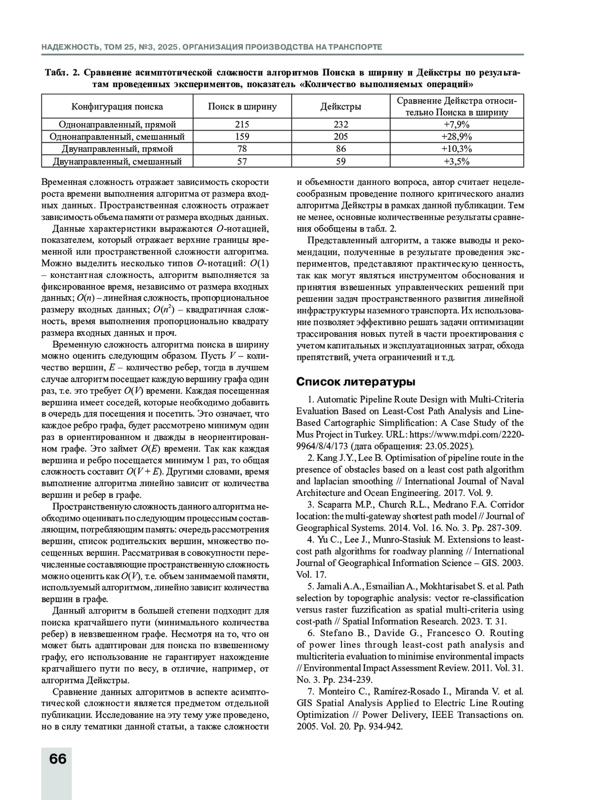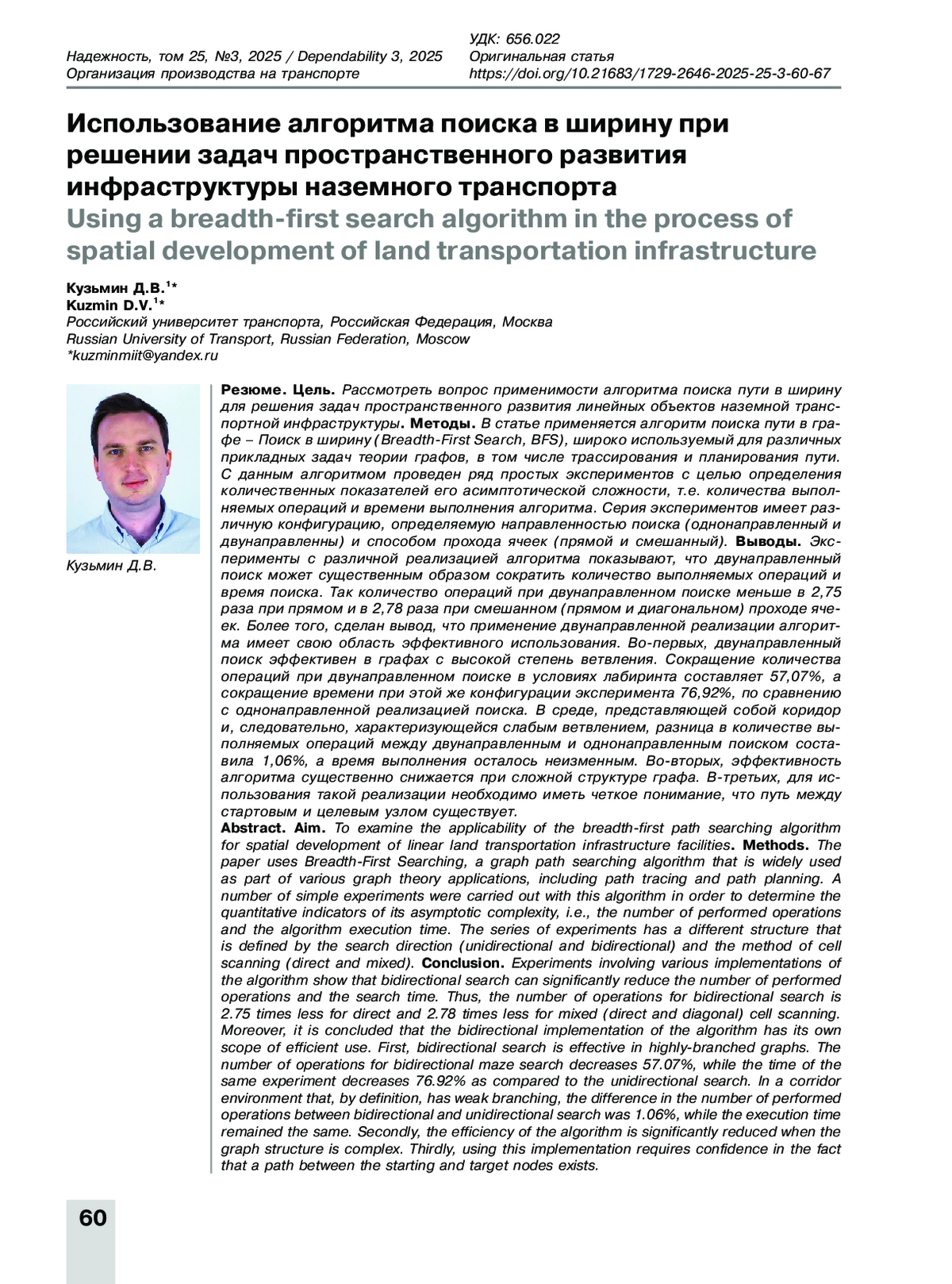 Цель. Рассмотреть вопрос применимости алгоритма поиска пути в ширину для решения задач пространственного развития линейных объектов наземной транспортной инфраструктуры. Методы. В статье применяется алгоритм поиска пути в графе – Поиск в ширину (Breadth-First Search, BFS), широко используемый для различных прикладных задач теории графов, в том числе трассирования и планирования пути. С данным алгоритмом проведен ряд простых экспериментов с целью определения количественных показателей его асимптотической сложности, т. е. количества выполняемых операций и времени выполнения алгоритма. Серия экспериментов имеет различную конфигурацию, определяемую направленностью поиска (однонаправленный и двунаправленны) и способом прохода ячеек (прямой и смешанный). Выводы. Эксперименты с различной реализацией алгоритма показывают, что двунаправленный поиск может существенным образом сократить количество выполняемых операций и время поиска. Так количество операций при двунаправленном поиске меньше в 2,75 раза при прямом и в 2,78 раза при смешанном (прямом и диагональном) проходе ячеек. Более того, сделан вывод, что применение двунаправленной реализации алгоритма имеет свою область эффективного использования. Во-первых, двунаправленный поиск эффективен в графах с высокой степень ветвления. Сокращение количества операций при двунаправленном поиске в условиях лабиринта составляет 57,07%, а сокращение времени при этой же конфигурации эксперимента 76,92%, по сравнению с однонаправленной реализацией поиска. В среде, представляющей собой коридор и, следовательно, характеризующейся слабым ветвлением, разница в количестве выполняемых операций между двунаправленным и однонаправленным поиском составила 1,06%, а время выполнения осталось неизменным. Во-вторых, эффективность алгоритма существенно снижается при сложной структуре графа. В-третьих, для использования такой реализации необходимо иметь четкое понимание, что путь между стартовым и целевым узлом существует.