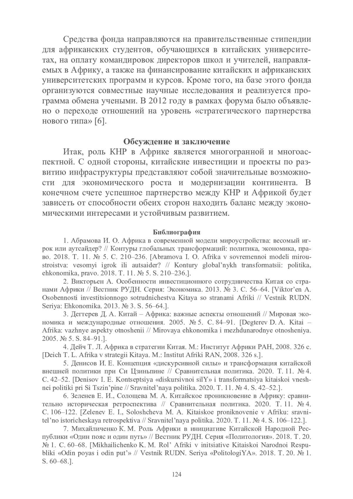 6. Зеленев Е. И., Солощева М. А. Китайское проникновение в Африку: сравнительно историческая ретроспектива // Сравнительная политика. 2020. Т. 11. № 4. С. 106-122. EDN: GBMYQJ