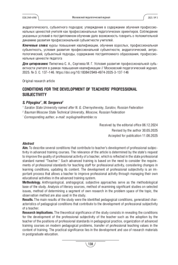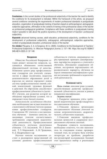 Цель. Описание ряда условий, способствующих развитию профессиональной субъектности учителя на курсах повышения квалификации. Актуальность темы статьи обусловлена запросом государства на повышение качества профессиональной деятельности учителя, что отражено в государственном профессиональном стандарте «Педагог». Такое повышение квалификации опирается на необходимость учёта требований профессиональных стандартов для педагогических работников к профессиональной деятельности, учёта изменения условий обучения, обновления его содержания. Развитие профессиональной субъектности - важный процесс, позволяющий учителю совершенствовать профессиональную деятельность через управление собственной учебной деятельностью в системе повышения квалификации.