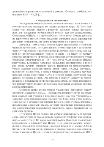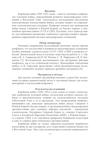 Статья посвящена анализу Корейской войны (1950-1953) как ключевого конфликта холодной войны, определившего геополитическую ситуацию в Восточной Азии. В работе рассматриваются причины конфликта, связанные с разделением Кореи по 38-й параллели, идеологическим противостоянием и глобальным противостоянием СССР и США. Особое внимание уделяется роли международных сил: поддержке Северной Кореи со стороны СССР и КНР, участию США и ООН в поддержке Южной Кореи. Анализируются основные этапы войны: наступление северокорейских войск, контрнаступление сил ООН, вмешательство Китая и переход к позиционной войне. Исследуется влияние конфликта на укрепление американского присутствия в регионе, развитие сотрудничества США с Японией и рост международного статуса КНР. Рассматриваются долгосрочные последствия войны: закрепление разделения Корейского полуострова, формирование демилитаризованной зоны, экономическое развитие Южной Кореи и укрепление позиций Китая. Статья подчеркивает роль Корейской войны в формировании концепции «ограниченной войны» в период холодной войны.