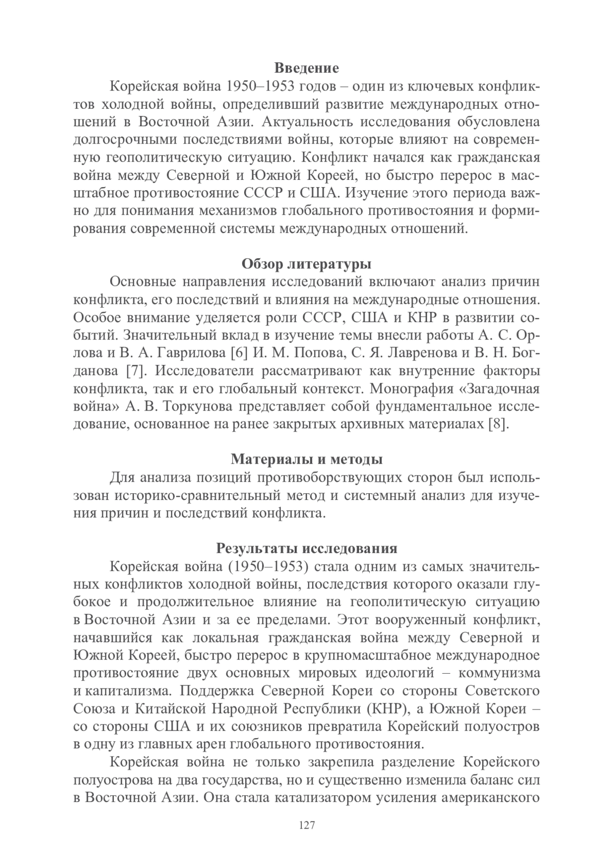 Корейская война 1950–1953 годов – один из ключевых конфликтов холодной войны, определивший развитие международных отношений в Восточной Азии. Актуальность исследования обусловлена долгосрочными последствиями войны, которые влияют на современную геополитическую ситуацию. Конфликт начался как гражданская война между Северной и Южной Кореей, но быстро перерос в масштабное противостояние СССР и США. Изучение этого периода важно для понимания механизмов глобального противостояния и формирования современной системы международных отношений.