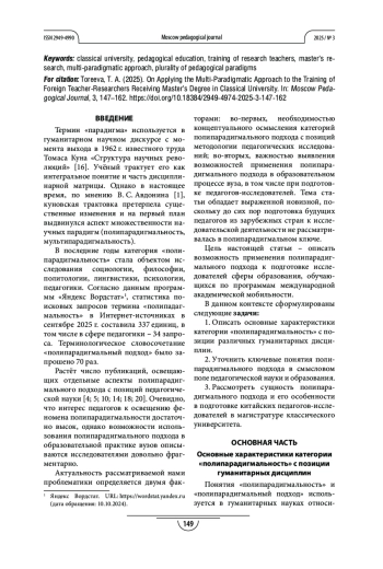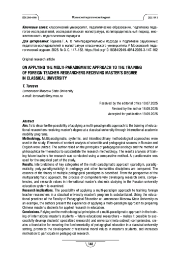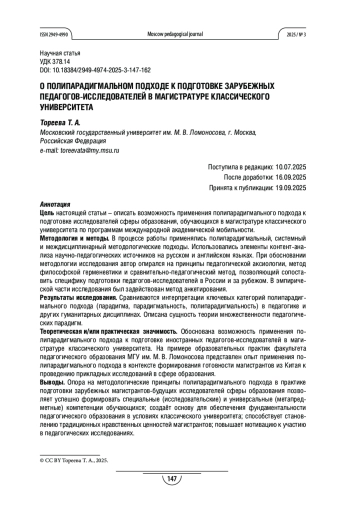 Результаты исследования. Сравниваются интерпретации ключевых категорий полипарадигмального подхода (парадигма, парадигмальность, полипарадигмальность) в педагогике и других гуманитарных дисциплинах. Описана сущность теории множественности педагогических парадигм. Теоретическая и/или практическая значимость. Обоснована возможность применения полипарадигмального подхода к подготовке иностранных педагогов-исследователей в магистратуре классического университета. На примере образовательных практик факультета педагогического образования МГУ им. М. В. Ломоносова представлен опыт применения полипарадигмального подхода в контексте формирования готовности магистрантов из Китая к проведению прикладных исследований в сфере образования.