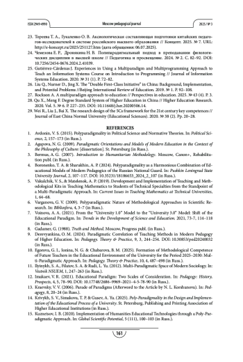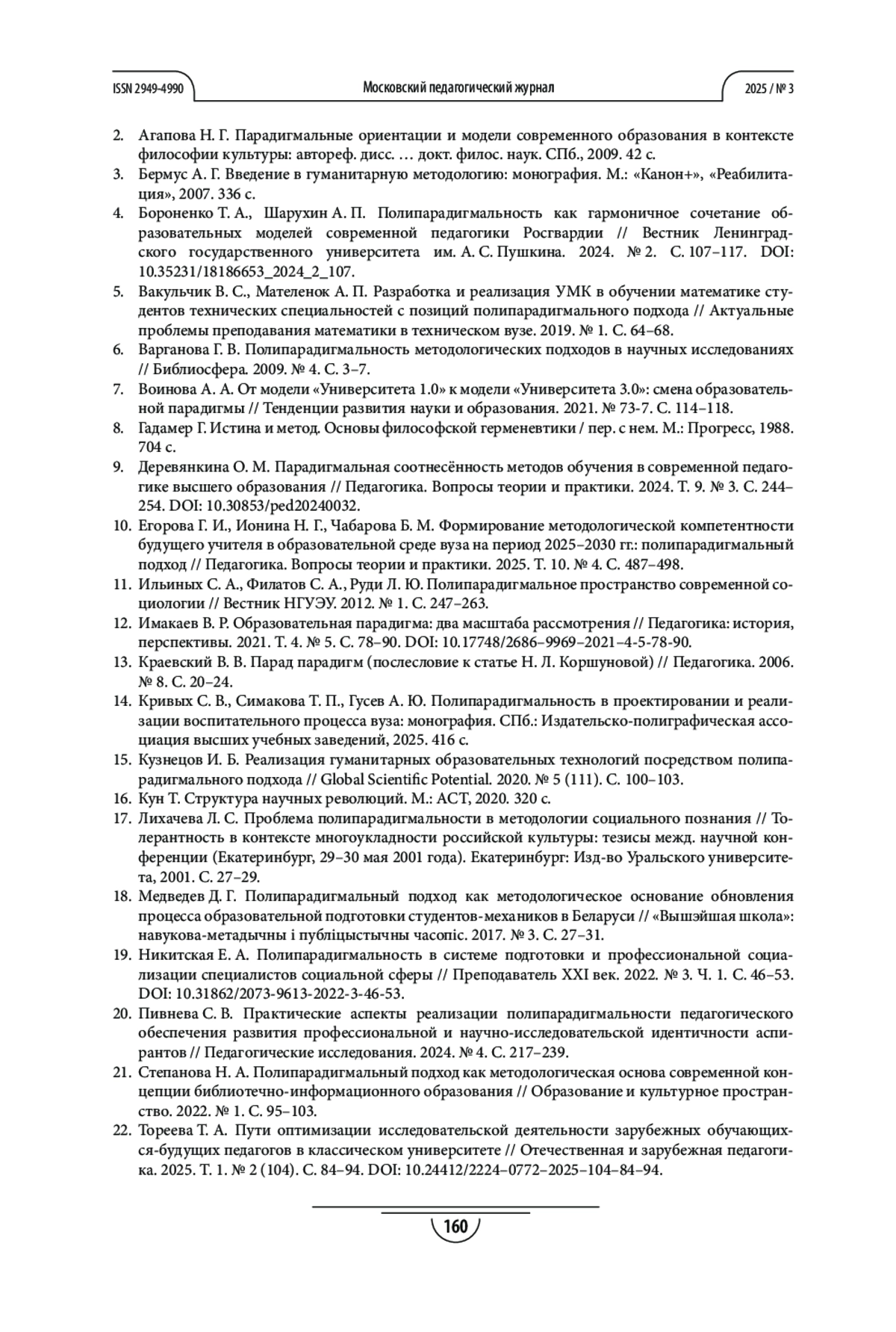 10. Егорова Г. И., Ионина Н. Г., Чабарова Б. М. Формирование методологической компетентности будущего учителя в образовательной среде вуза на период 2025-2030 гг.: полипарадигмальный подход // Педагогика. Вопросы теории и практики. 2025. Т. 10. № 4. С. 487-498. EDN: GDCVBG