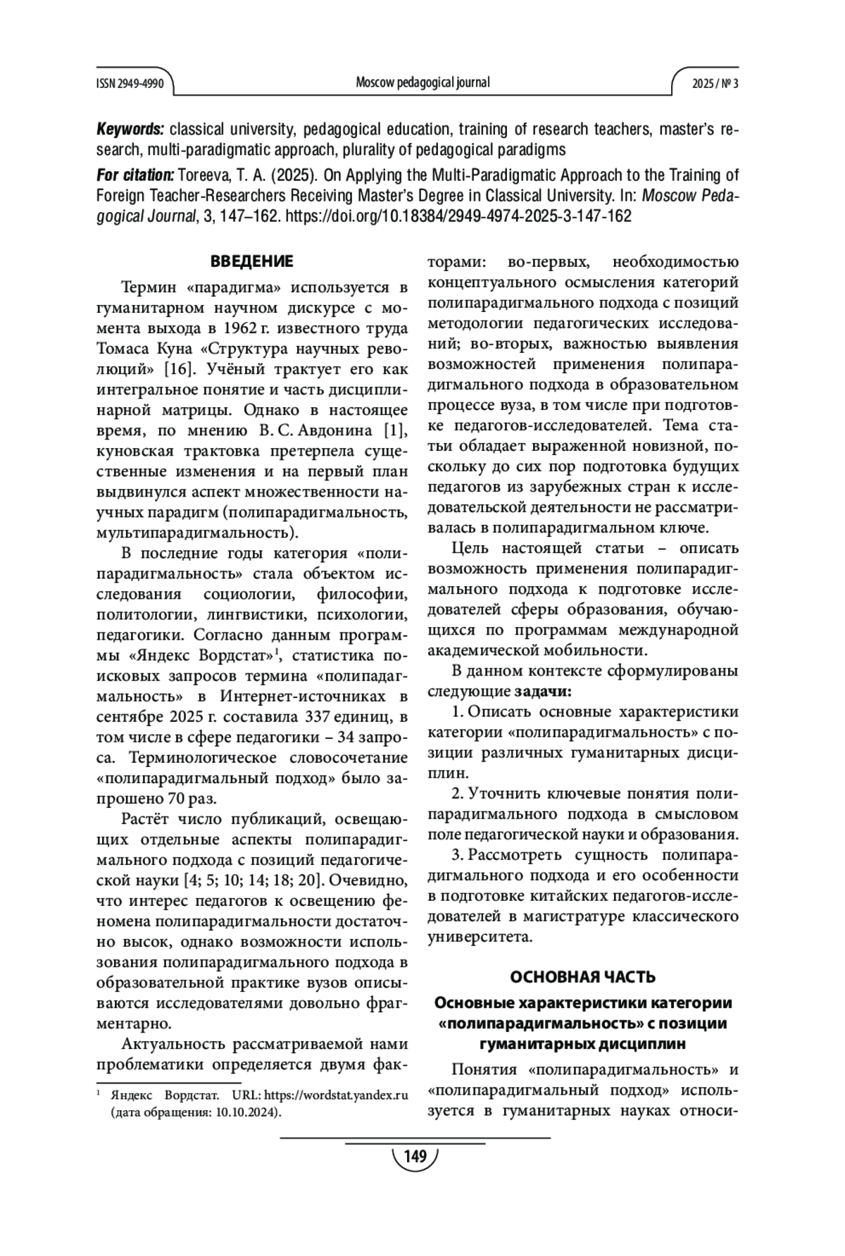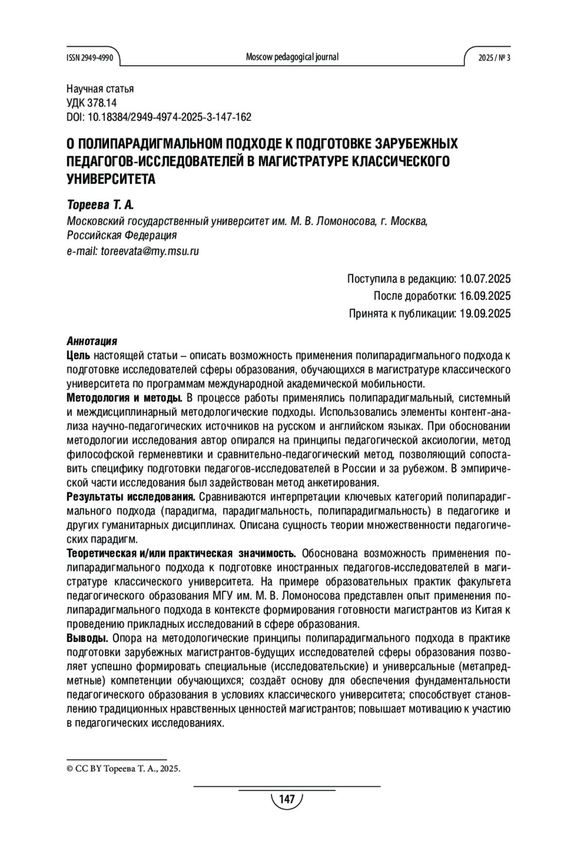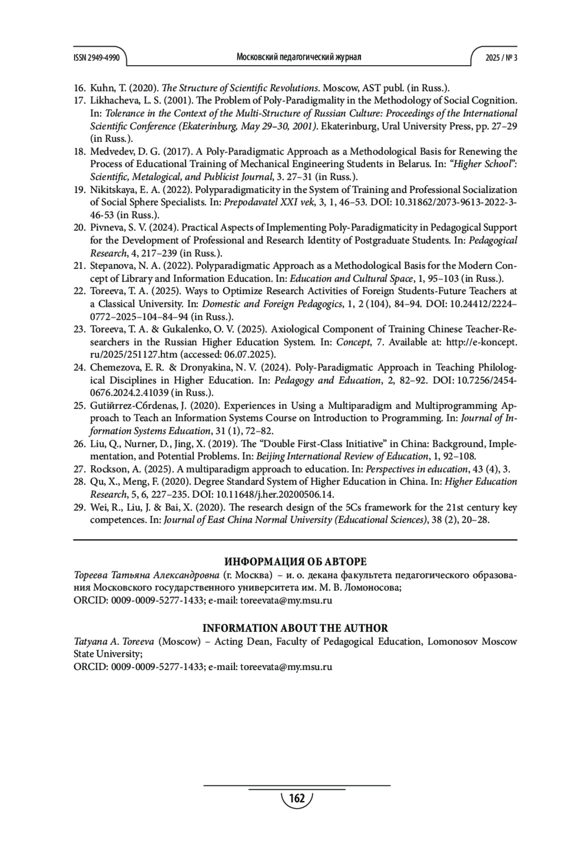 23. Тореева Т. А., Гукаленко О. В. Аксиологическая составляющая подготовки китайских педагогов-исследователей в системе российского высшего образования // Концепт. 2025. № 7. URL: http://e-koncept.ru/2025/251127.htm (дата обращения: 06.07.2025).