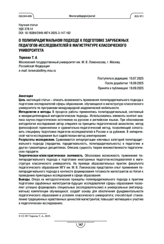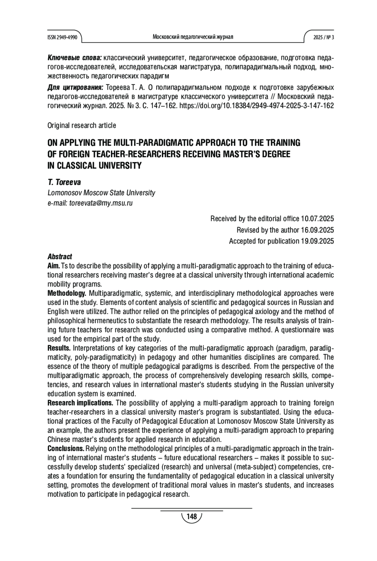 Выводы. Опора на методологические принципы полипарадигмального подхода в практике подготовки зарубежных магистрантов-будущих исследователей сферы образования позволяет успешно формировать специальные (исследовательские) и универсальные (метапредметные) компетенции обучающихся; создаёт основу для обеспечения фундаментальности педагогического образования в условиях классического университета; способствует становлению традиционных нравственных ценностей магистрантов; повышает мотивацию к участию в педагогических исследованиях.