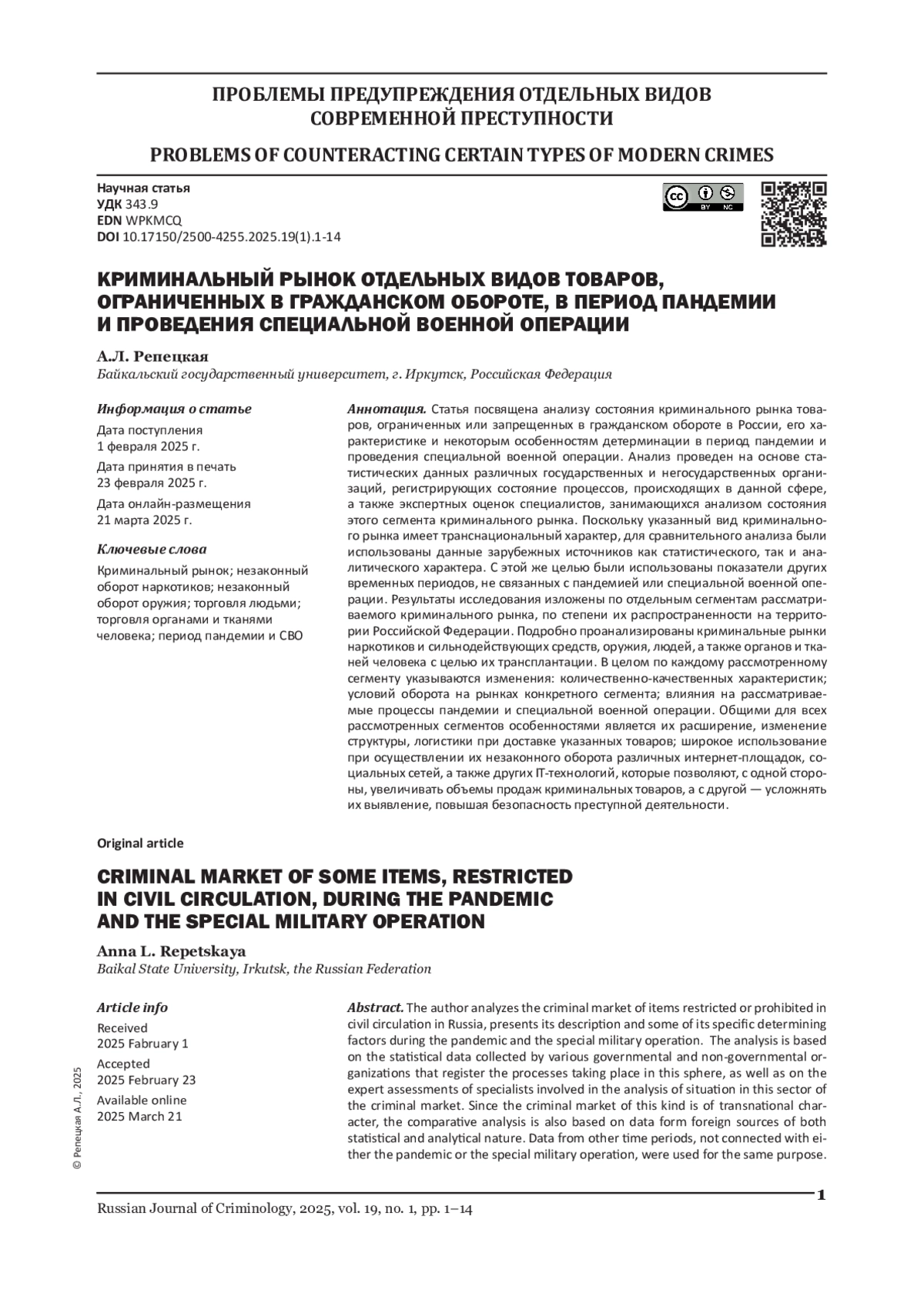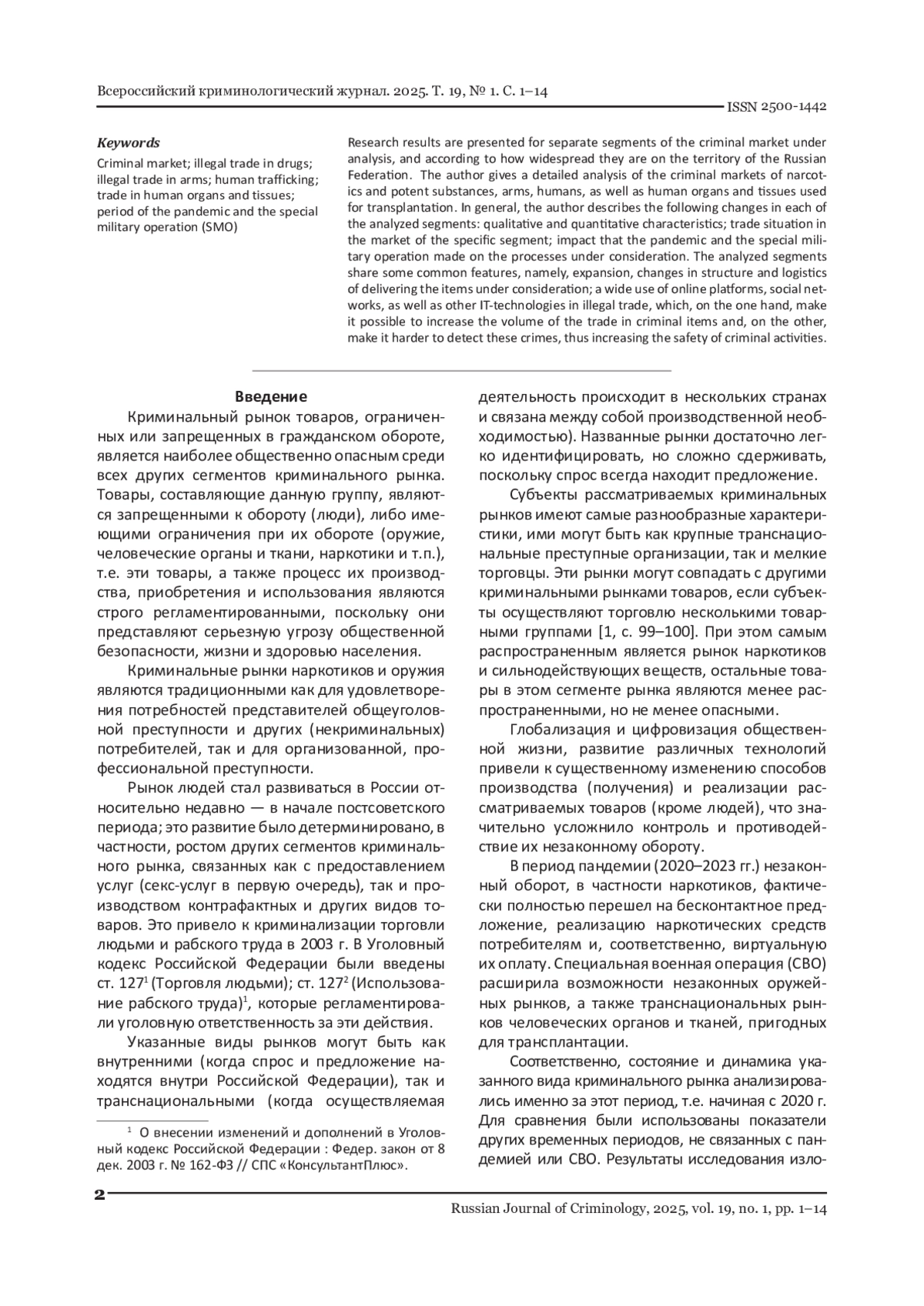 Статья посвящена анализу состояния криминального рынка товаров, ограниченных или запрещенных в гражданском обороте в России, его характеристике и некоторым особенностям определения в период пандемии и проведения военных операций. Анализ проводится на основе статистических данных различных государственных и негосударственных организаций, регистрирующих состояние процессов, происходящих в данной сфере, а также экспертных заключений специалистов, занимающихся анализом состояния этого сегмента криминального рынка. Поскольку указанный вид криминального рынка имеет транснациональный характер, для сравнительного анализа были использованы данные зарубежных источников как статистического, так и аналитического характера. В этой же цели были использованы показатели других временных периодов, не относящиеся к пандемии или военной операции. Результаты исследования предлагаются по направлению к сегментам современного криминального рынка, по степени их распространенности на территории Российской Федерации. Подробно проанализированы криминальные наркотики и сильнодействующие средства, оружие, люди, а также органы и ткани человека с целью их трансплантации. В целом по каждому рассматриваемому сегменту показаны изменения: количественно-качественных характеристик; условия оборота на рынке определения сегмента; Обзор рассмотренных процессов пандемии и военных операций. Общими для всех рассматриваемых сегментов особенностями является их расширение, изменение структуры, логистики при доставке указанного товара; широкое использование при их внезапном обороте различных интернет-площадок, социальных сетей, а также других IT-технологий, позволяет, с одной стороны, увеличить объемы продаж криминальных товаров, а с другой - усложнить их проявление, повысить безопасность преступной деятельности.