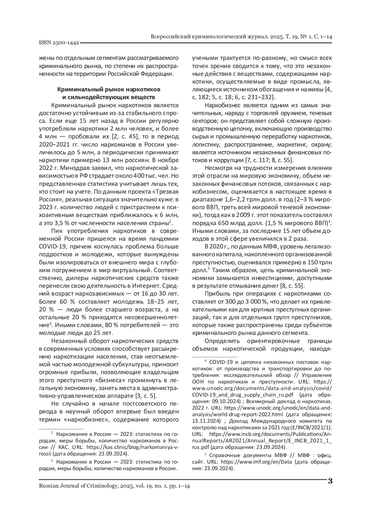 8. Смелова С.В. Наркобизнес как сектор теневой экономики и угрозы экономической безопасности страны / С.В. Смелова, Р.Р. Тотоев. // Теневая экономика. - 2023. - Т. 7, № 1. - С. 55-72. DOI: 10.18334/tek.7.1.116937 EDN: XBCXFM