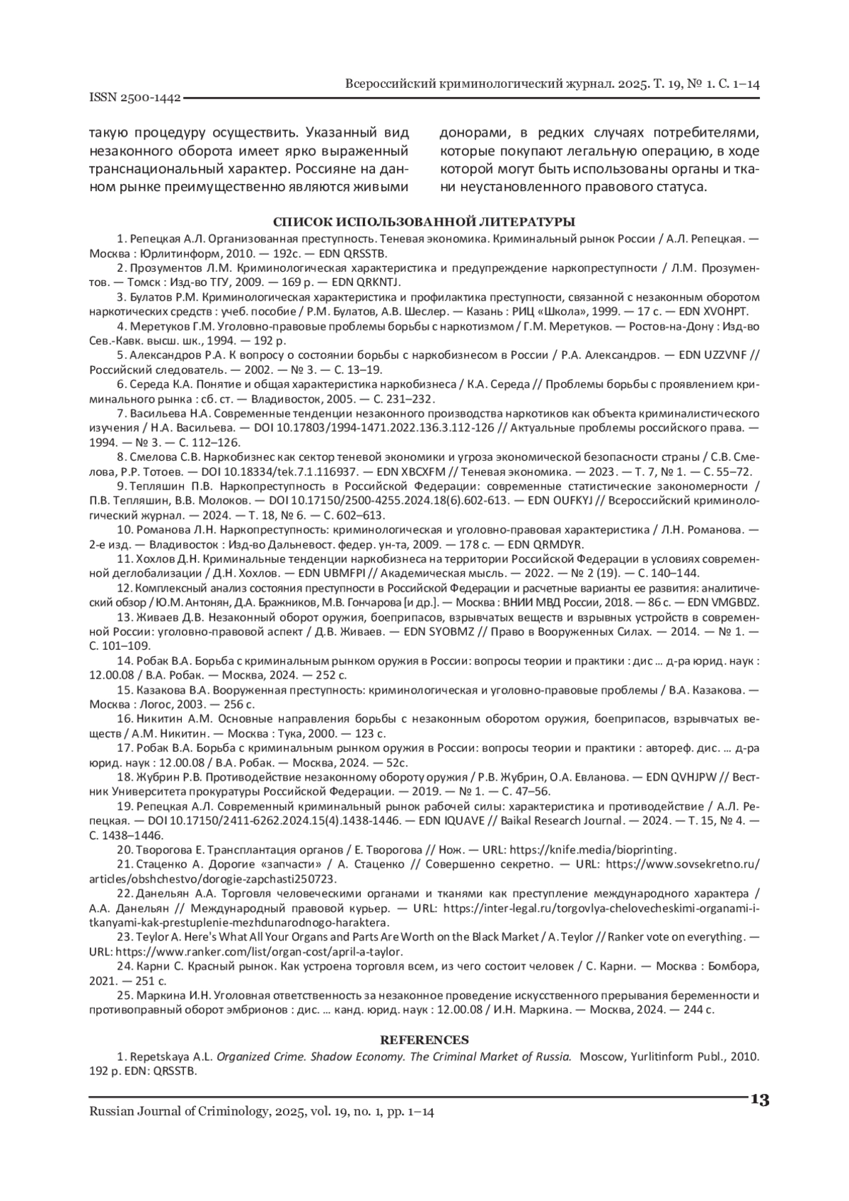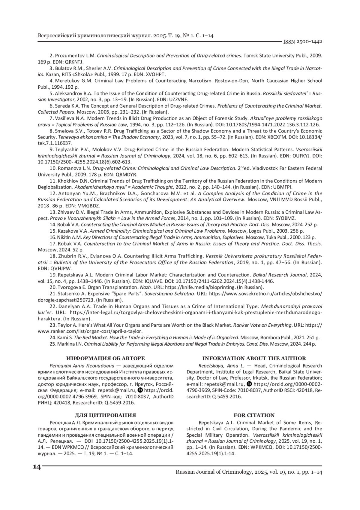 19. Репецкая А.Л. Современный криминальный рынок рабочей силы: характеристика и противодействие / А.Л. Репецкая. 10.17150/2411-6262.2024.15(4).1438-1446. // Байкальский научный журнал. - 2024. - Т. 15, № 4. - С. 1438-1446. DOI: 10.17150/2411-6262.2024.15(4).1438-1446.BaikalResearchJournal.-2024.- EDN: IQUAVE