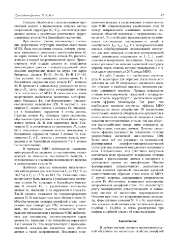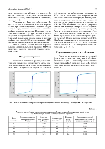 В работе изучено влияние магнитоимпульс-ной обработки на магнитные свойства аморфной М. Н. Шипко, А. И. Тихонов, М. А. Степович и др. 98 электротехнической стали. Установлено, что маг-нитоимпульсная обработка аморфизированной электротехнической стали способствует увеличе-нию её удельной намагниченности насыщения, остаточной намагниченности и коэффициента прямоугольности петли магнитного гистерезиса. Такие изменения связаны с повышением степени порядка в расположении атомов в материале и уменьшении уровня его аморфизации. Координационные ассоциаты, формируемые атомами Si, B, Fe, аналогичны тем, которые свойственны кристаллическим фазам Fe3(BSi) и реализуются при нагреве быстроохлаждённой стали. Предполагается, что механизм наблюдаемых процессов связан с упорядочением магнитной спин-системы стали под влиянием импульсного магнитного поля.