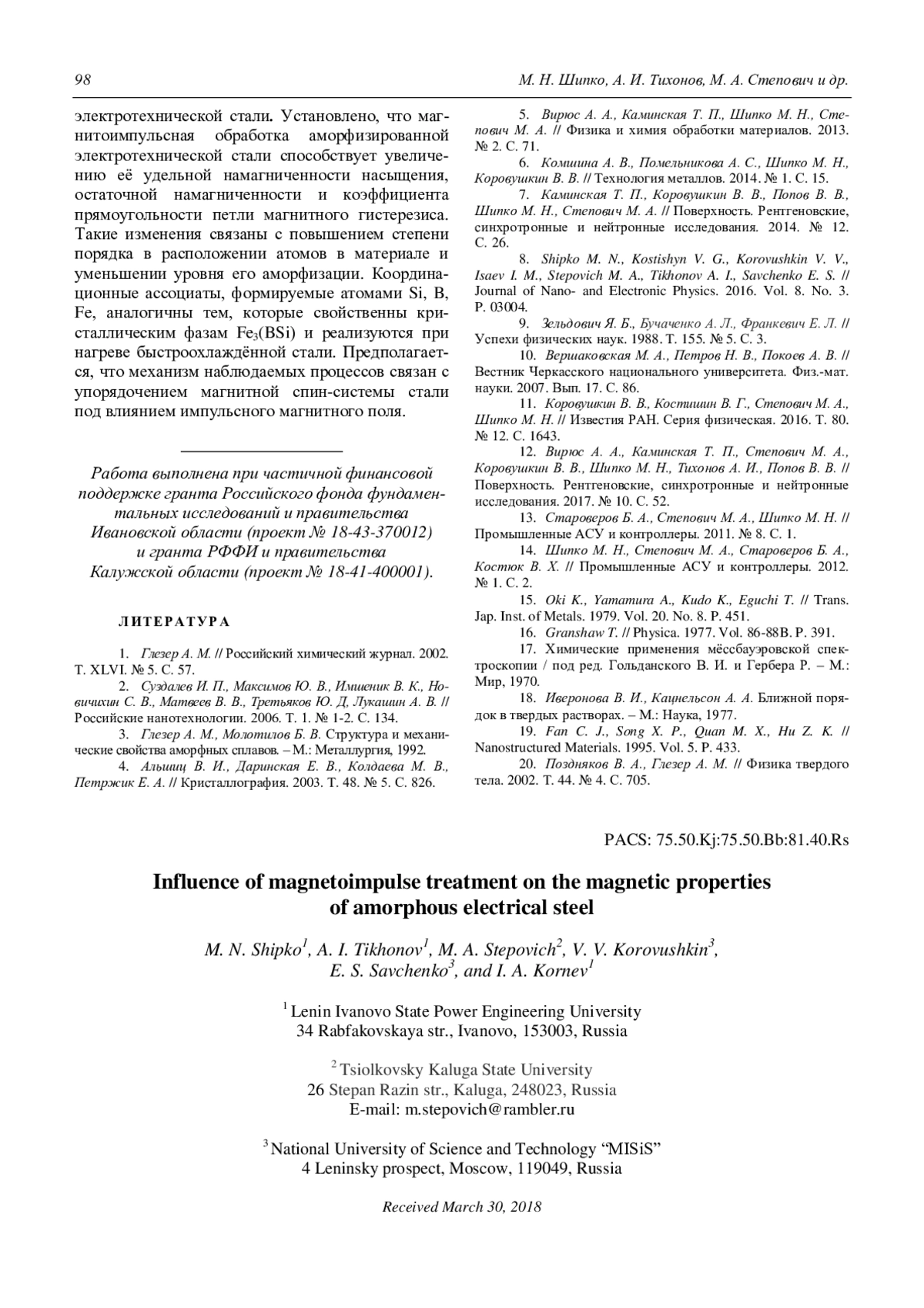 8. Shipko M. N., Kostishyn V. G., Korovushkin V. V., Isaev I. M., Stepovich M. A., Tikhonov A. I., Savchenko E. S. // Journal of Nano- and Electronic Physics. 2016. Vol. 8. No. 3. P. 03004.