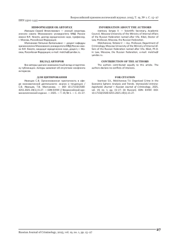 8. Молчанова Т.В. Организованная преступность в сфере экономической деятельности: состояние и тенденции развития / Т.В. Молчанова. // Вестник Московского государственного областного университета. Серия: Юриспруденция. - 2021. - № 3. - С. 111-117. DOI: 10.18384/2310-6794-2021-3-111-117 EDN: WZCYON