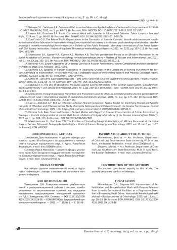 1. Смитсон Х. Разоблачение и раскрытие: Влияние COVID-19 на систему содержания под стражей несовершеннолетних. Убедительный аргумент в пользу идеологических изменений / Х. Смитсон, Д. Джамп. 10.1093/bjc/azae015. // Британский журнал криминологии. - 2024. - Том 64. - С. 1328-1346. DOI: 10.1093/bjc/azae015.BritishJournalofCriminology.-2024.-Vol.64.-P.1328-1346 EDN: SXYDMK