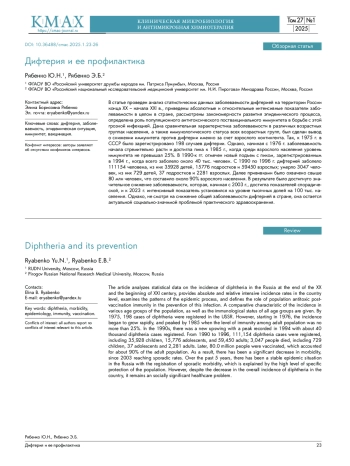 В статье проведен анализ статистических данных заболеваемости дифтерией на территории России конца ХХ – начала ХХI в., приведены абсолютные и относительные интенсивные показатели заболеваемости в целом в стране, рассмотрены закономерности развития эпидемического процесса, определена роль популяционного антитоксического поствакцинального иммунитета в борьбе с этой грозной инфекцией. Дана сравнительная характеристика заболеваемости в различных возрастных группах населения, а также иммунологического статуса всех возрастных групп, был сделан вывод о снижении иммунитета против дифтерии именно за счет взрослого контингента. Так, к 1975 г. в СССР было зарегистрировано 198 случаев дифтерии. Однако, начиная с 1976 г. заболеваемость начала стремительно расти и достигла пика к 1985 г., когда среди взрослого населения уровень иммунитета не превышал 25%. В 1990-х гг. отмечен новый подъем с пиком, зарегистрированным в 1994 г., когда всего заболело около 40 тыс. человек. С 1990 по 1996 г. дифтерией заболело 111154 человека, из них 35928 детей, 15776 подростков и 59450 взрослых; умерло 3047 человек, из них 729 детей, 37 подростков и 2281 взрослых. Далее прививками было охвачено свыше 80 млн человек, что составило около 90% взрослого населения. В результате было достигнуто значительное снижение заболеваемости, которая, начиная с 2003 г., достигла показателей спорадической, и к 2023 г. интенсивный показатель установился на уровне тысячных долей на 100 тыс. населения. Однако, не смотря на снижение общей заболеваемости дифтерией в стране, она остается актуальной социально-значимой проблемой практического здравоохранения.