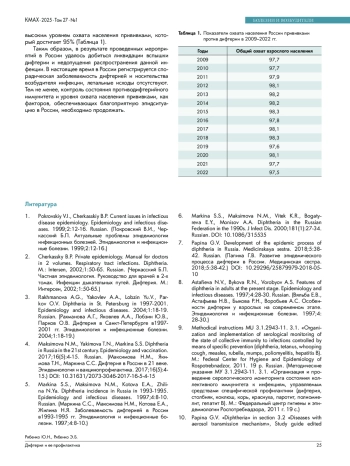 6. Markina S.S., Maksimova N.M., Vitek K.R., Bogatyreva E.Y., Monisov A.A. Diphtheria in the Russian Federation in the 1990s. J Infect Dis. 2000;181(1):27-34. Russian. DOI: 10.1086/315535