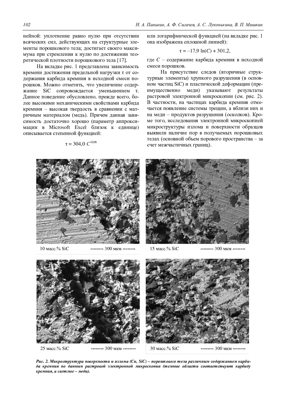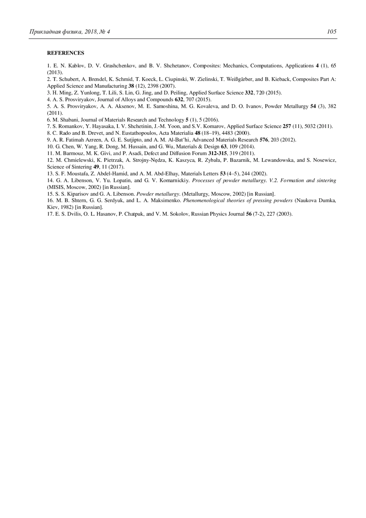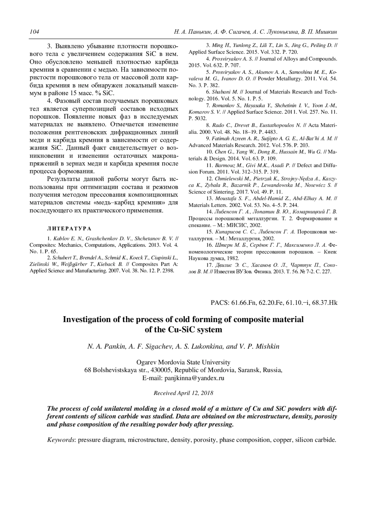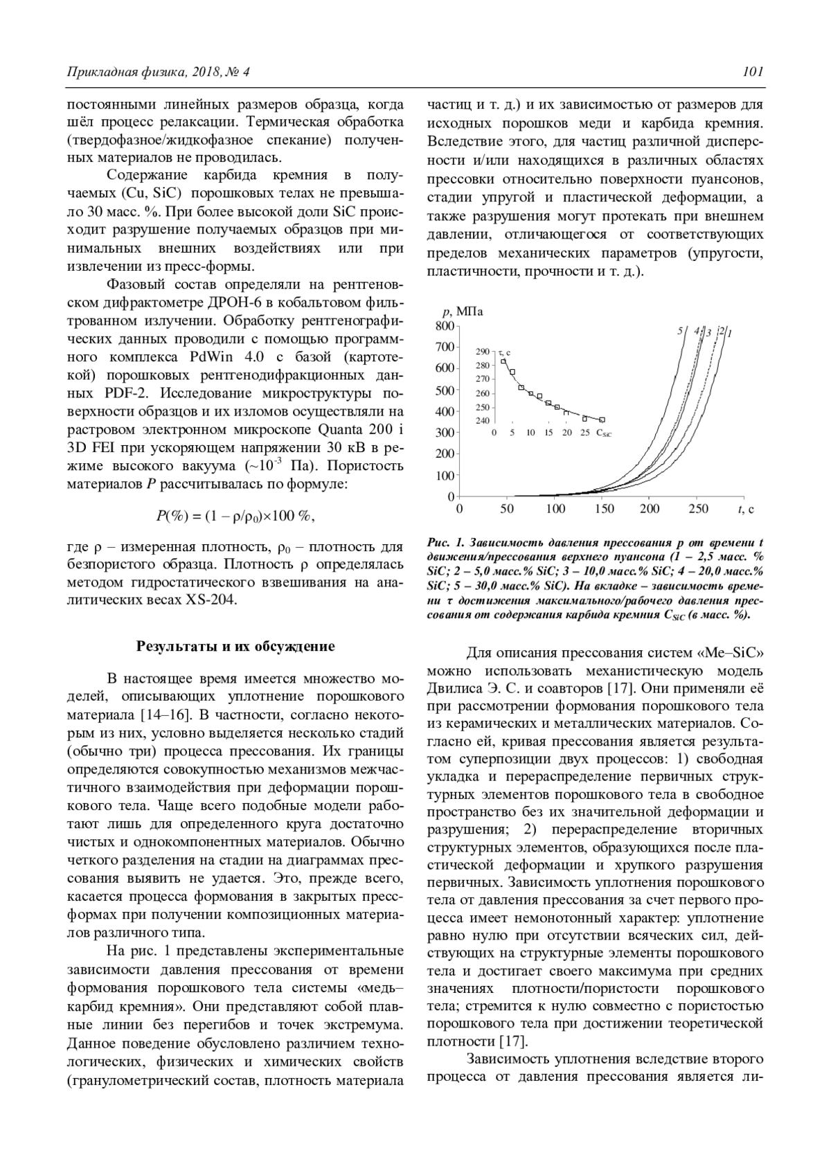 ПАНЬКИН Н. А., СИГАЧЕВ А. Ф., МИШКИН В. П., ЛУКОНЬКИНА А. С. ИССЛЕДОВАНИЕ ПРОЦЕССА ХОЛОДНОГО ФОРМОВАНИЯ КОМПОЗИЦИОННОГО МАТЕРИАЛА СИСТЕМЫ CU–SIC // ПРИКЛАДНАЯ ФИЗИКА. 2018. №4