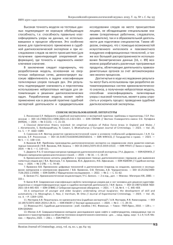 1. Россинская Е.Р. Нейросети в судебной экспертологии и экспертной практике: проблемы и перспективы / Е.Р. Россинская // Вестник Университета имени О.Е. Кутафина (МГЮА). - 2024. - № 3 (115). - С. 21-33. DOI: 10.17803/2311-5998.2024.115.3.021-033 EDN: FZKHHN