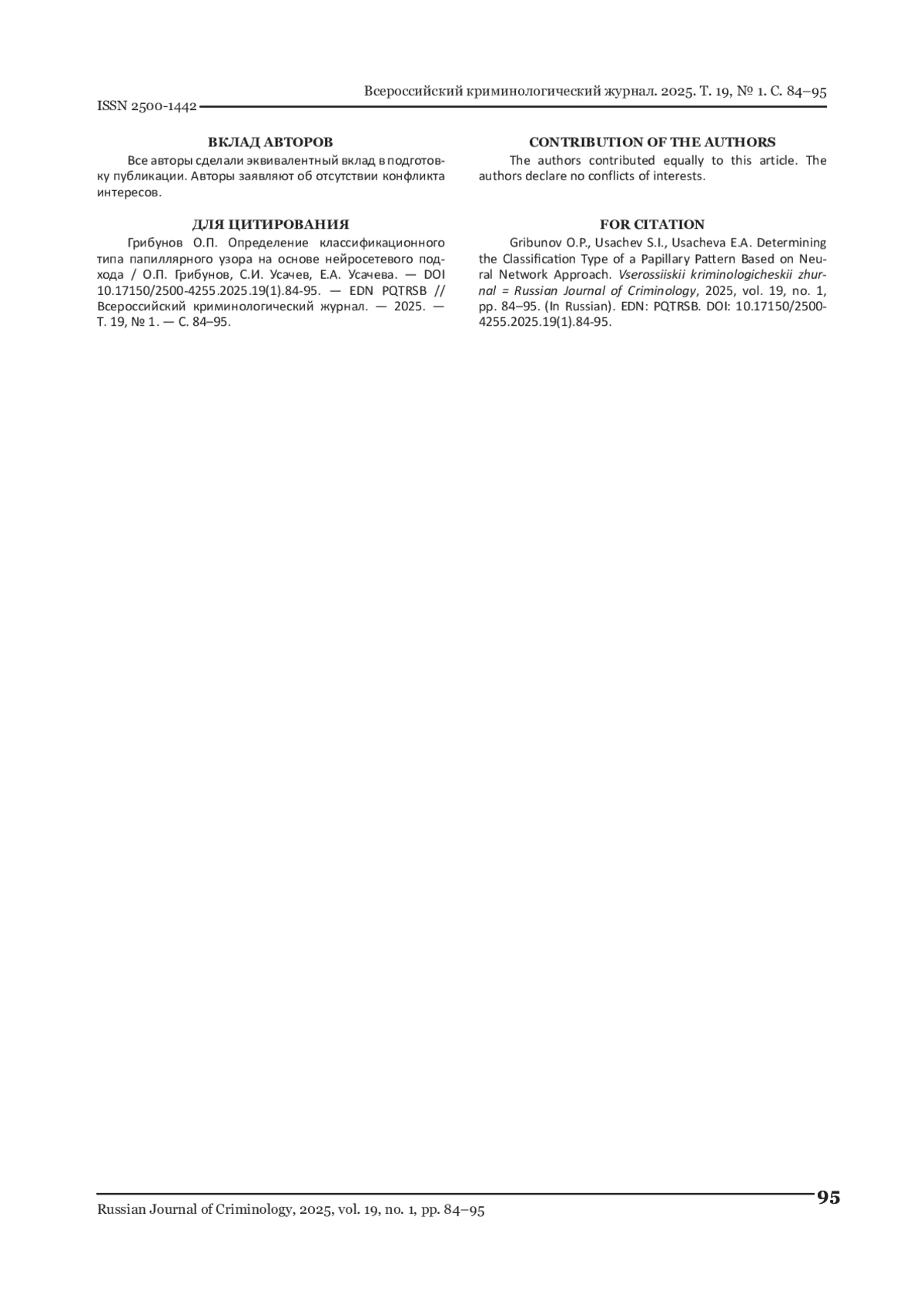 Работа посвящена рассмотрению вопросов, связанных с изучением папиллярных узоров ладоней и пальцев рук человека для дальнейшего решения задач идентификационного и диагностического характера. Авторами отмечается тенденция к стремительному развитию технологий искусственного интеллекта, среди которых особое место занимают нейронные сети. При этом также высказывается мнение о том, что использование нейронных сетей в криминалистике, особенно в задачах дактилоскопии, сопряжено с рядом трудностей, включая сбор, преобразование и обработку данных. Отмечается, что разработка модели по исследованию папиллярных узоров на основе нейросетевого подхода может найти применение как в реальной практике судебной экспертной деятельности и предварительном исследовании следов на месте происшествия лицами не обладающими специальными знаниями (оперативные работники, следователи, дознаватели), так и в образовательной деятельности для подготовки специалистов. В работе авторы описывают архитектуру используемой нейронной сети, процесс подготовки данных, включающий предварительную обработку изображений и создание тренировочного и тестового наборов, а также демонстрируют результаты экспериментальной проверки эффективности предложенного метода, включая показатели точности и полноты.