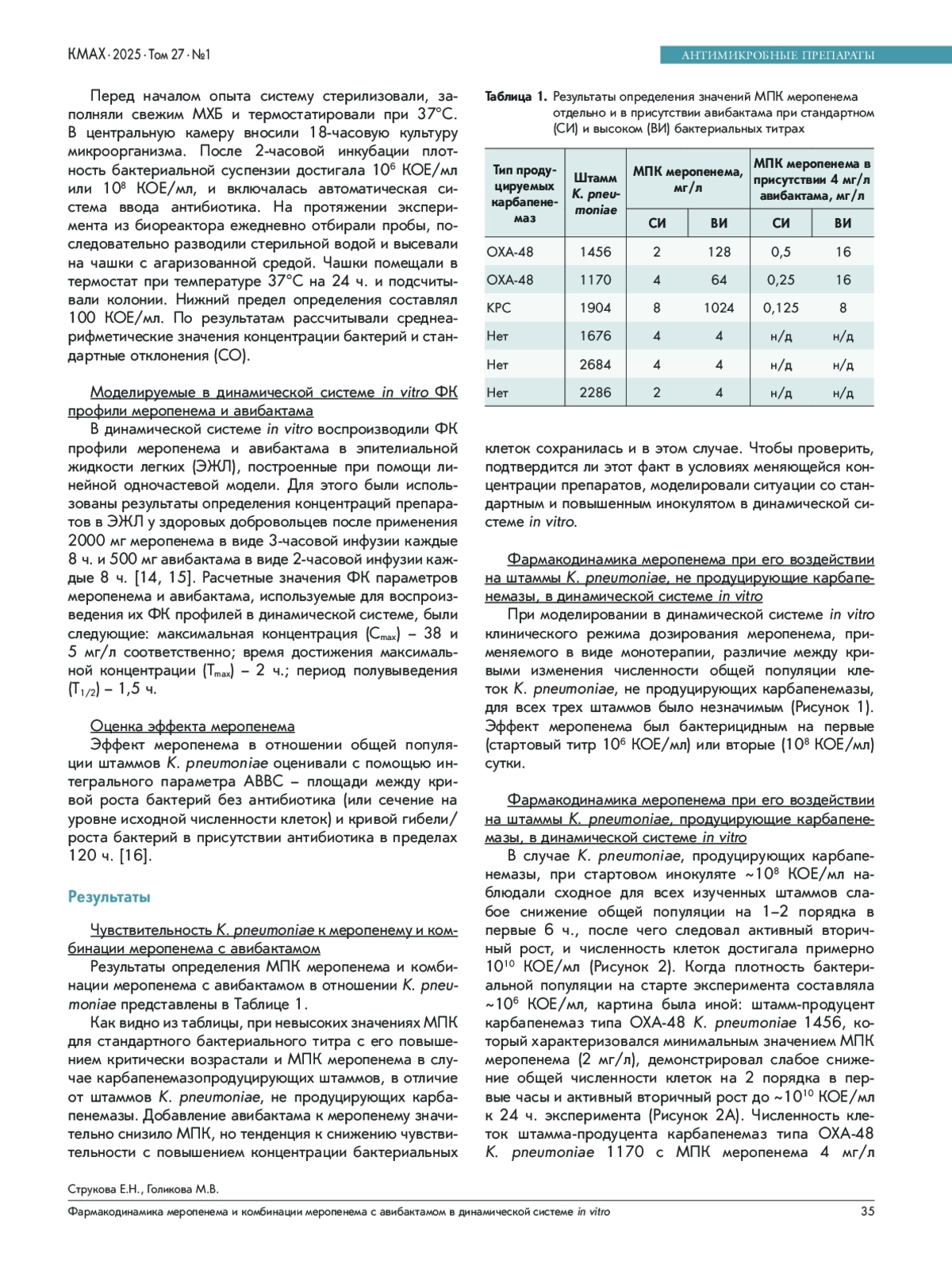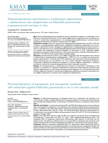 Результаты. В динамической системе in vitro эффект меропенема был бактерицидным для штаммов K. pneumoniae, не продуцирующих карбапенемазы, с МПК 2-4 мг/л, в то время как штаммы-продуценты карбапенемаз с сопоставимыми МПК меропенема преимущественно демонстрировали быстрый вторичный рост как при высокой, так и при низкой стартовой концентрации бактерий в эксперименте. Добавление авибактама приводило к усилению эффекта меропенема и снижению численности клеток всех штаммов-продуцентов при обоих стартовых инокулятах.