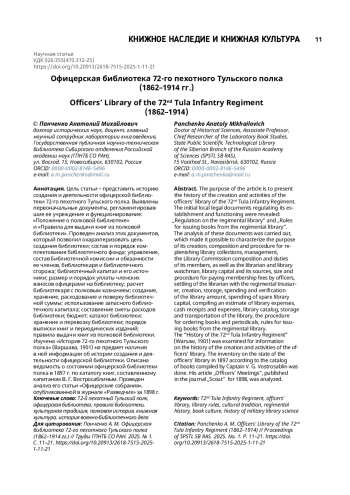 Цель статьи – представить историю создания и деятельности офицерской библиотеки 72-го пехотного Тульского полка.