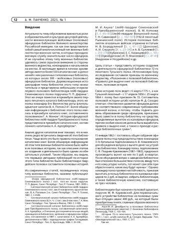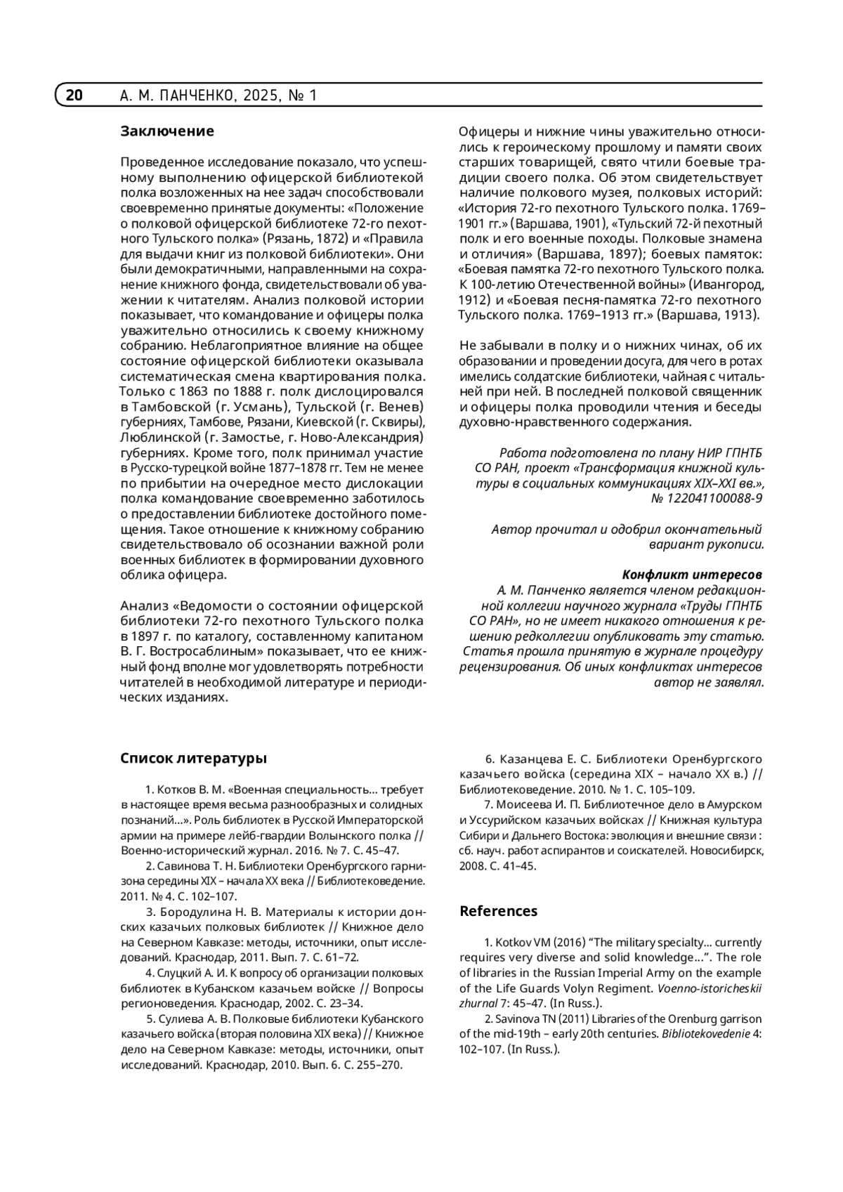 1. Котков В. М. «Военная специальность… требует в настоящее время весьма разнообразных и солидных познаний…». Роль библиотек в Русской Императорской армии на примере лейб-гвардии Волынского полка // Военно- исторический журнал. 2016. № 7. С. 45-47.