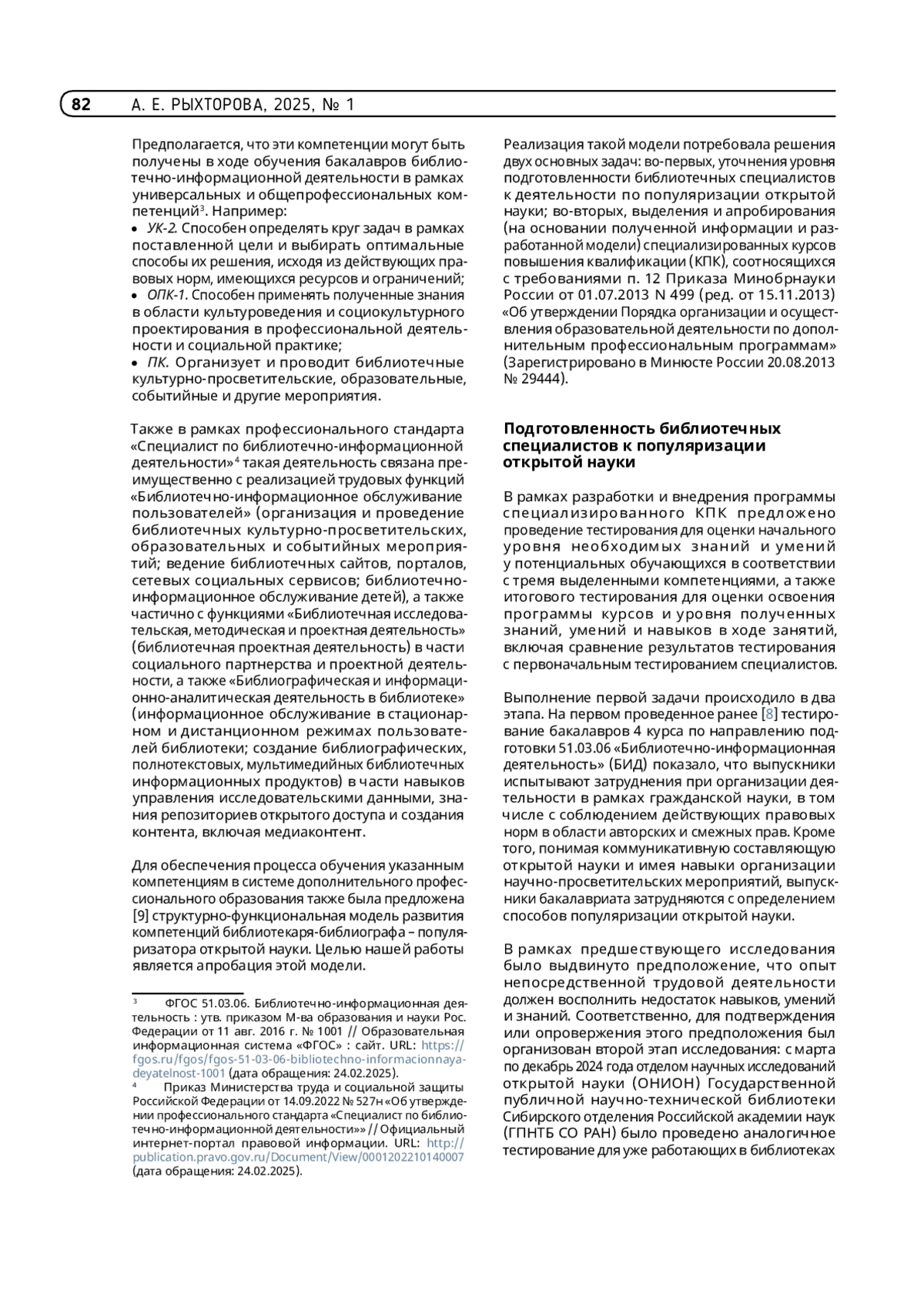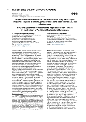 8. Рыхторова А. Е. Готовность выпускников направления «Библиотечно-информационная деятельность» к популяризации открытой науки // Научные и технические библиотеки. 2024. № 11. С. 141-159. https://doi.org/10.33186/1027-3689-2024-11-141-159