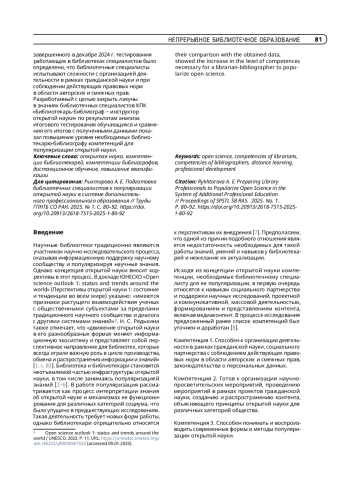 9. Рыхторова А. Е. Формирование компетенций библиотекаря-библиографа - популяризатора открытой науки в дополнительном профессиональном образовании // Библиотековедение. 2024. Т. 73, № 3. С. 273-287. https://doi.org/10.25281/0869-608X-2024-73-3-273-287