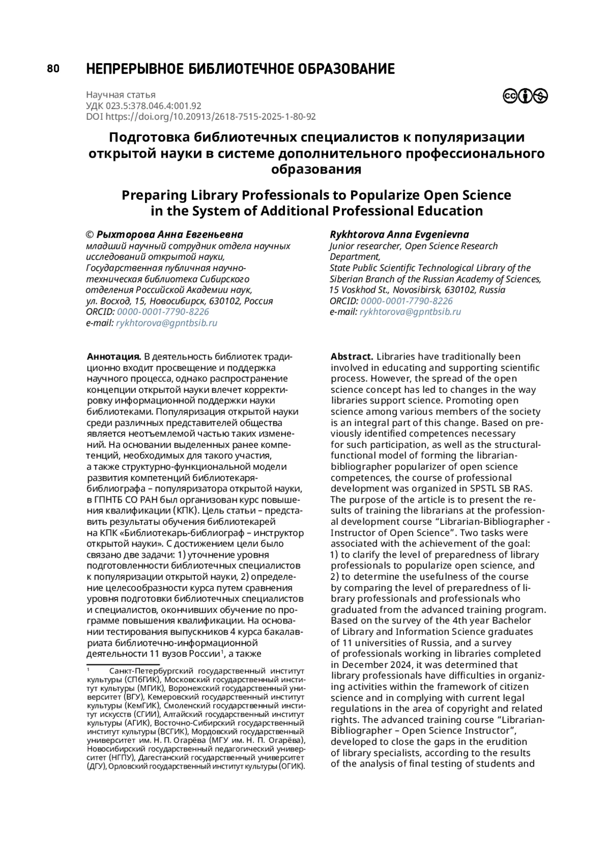 В деятельность библиотек традиционно входят просвещение и поддержка научного процесса, однако распространение концепции открытой науки влечет корректировку информационной поддержки науки библиотеками. Популяризация открытой науки среди различных представителей общества является неотъемлемой частью таких изменений. На основании выделенных ранее компетенций, необходимых для такого участия, а также структурно-функциональной модели развития компетенций библиотекаря-библиографа – популяризатора открытой науки, в ГПНТБ СО РАН был организован курс повышения квалификации (КПК).