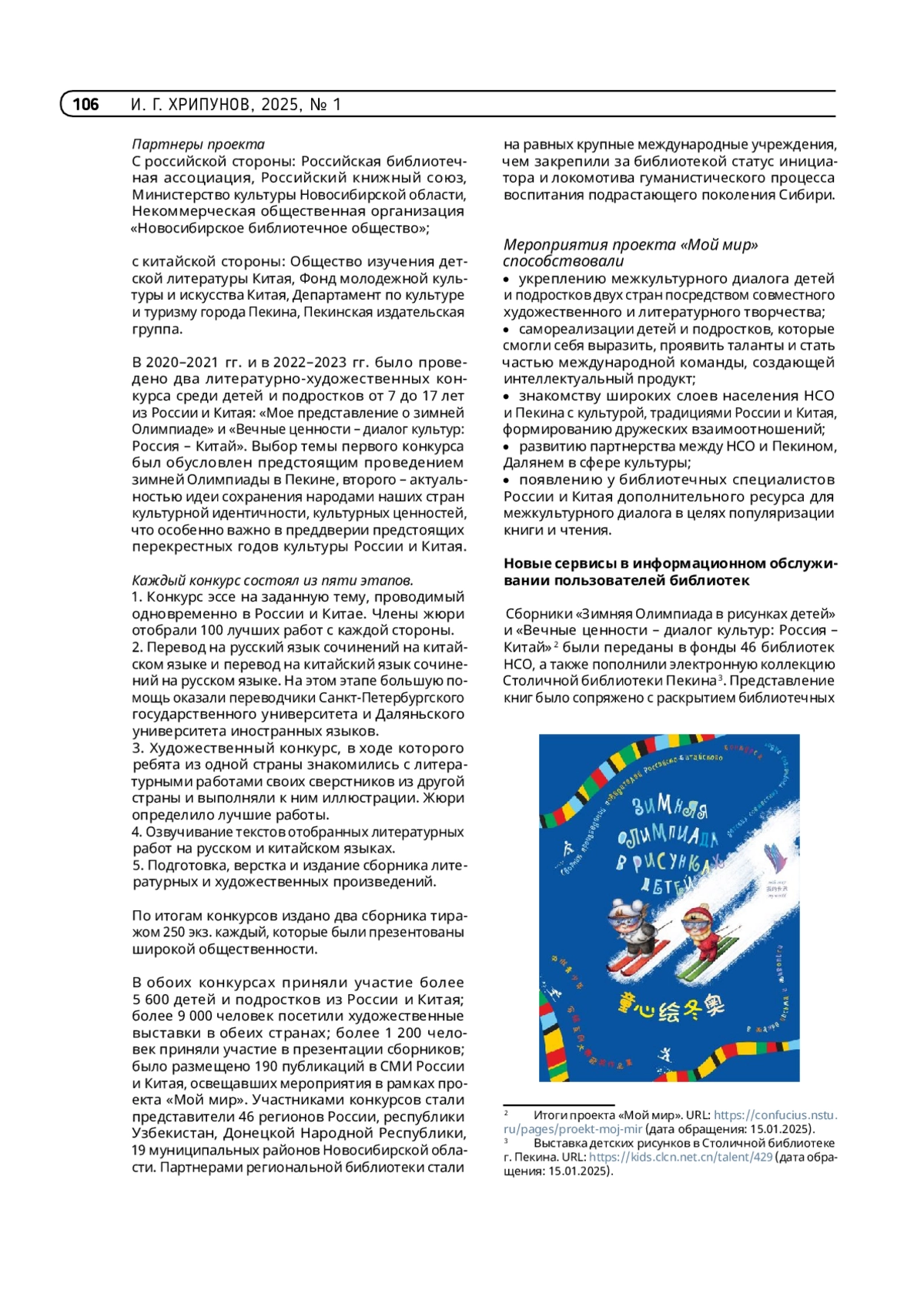 Для цитирования: Хрипунов И. Г. Российско-китайский детский творческий проект «Мой мир» в Новосибирской области. Труды ГПНТБ СО РАН. 2025;(1):105-107.