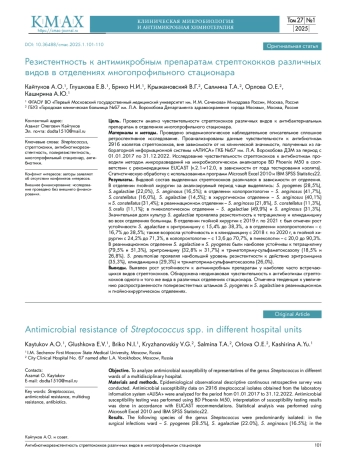 Выводы. Выявлен рост устойчивости к антимикробным препаратам у наиболее часто встречающихся видов стрептококков. Обнаружена неодинаковая чувствительность к антибиотикам стрептококков одного и того же вида в различных отделениях стационара. Отмечена тенденция к увеличению распространенности полирезистентных штаммов S. pyogenes и S. agalactiae в реанимационном и гнойно-хирургическом отделениях.