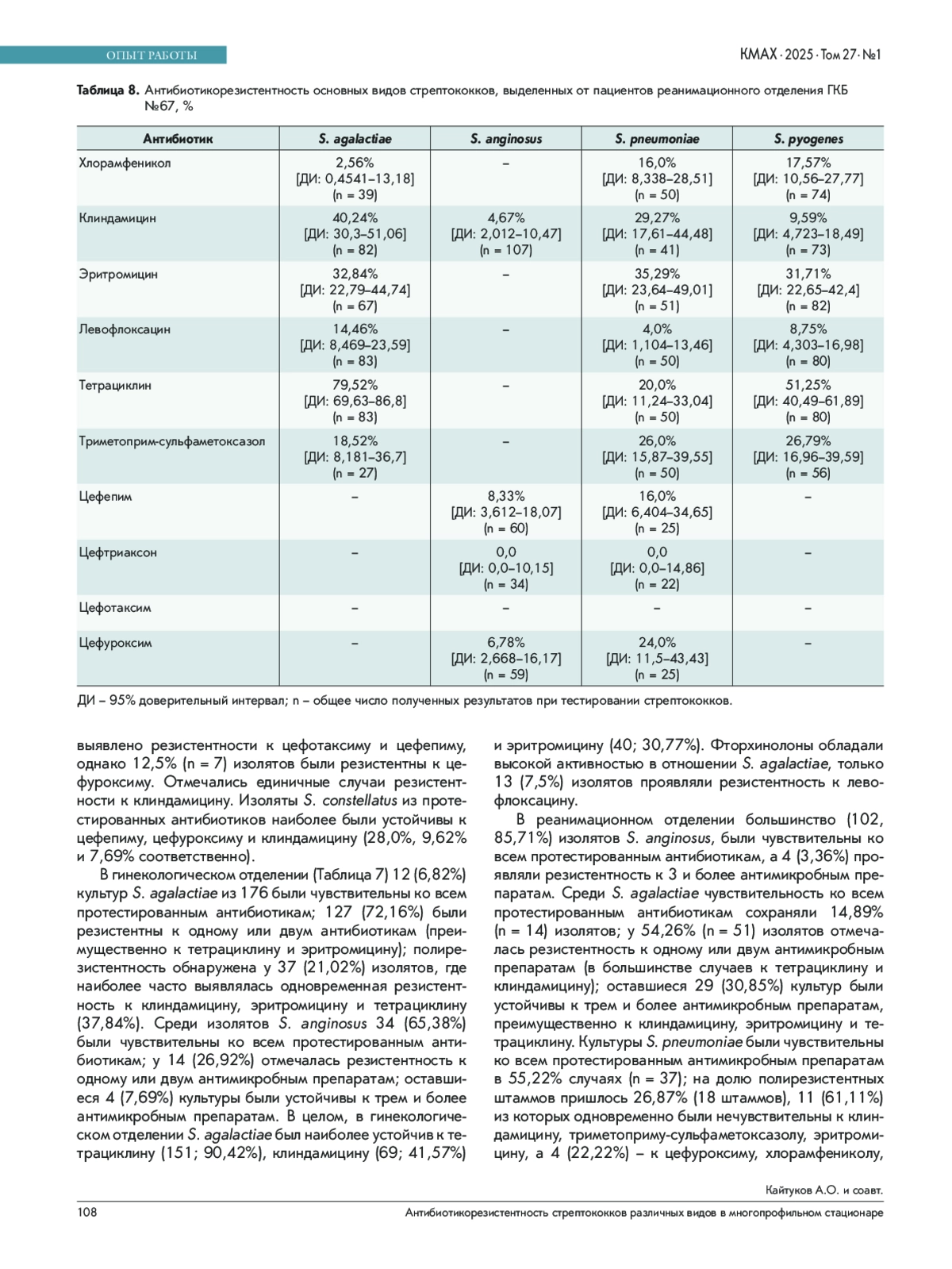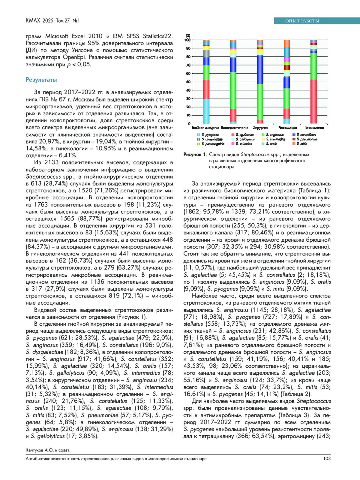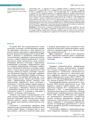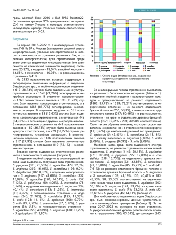 Результаты. Видовой состав выделенных стрептококков различался в зависимости от отделения. В отделении гнойной хирургии за анализируемый период чаще выделялись: S. pyogenes (28,5%), S. agalactiae (22,0%), S. anginosus (16,5%); в отделении колопроктологии – S. anginosus (41,7%), S. constellatus (16,0%), S. agalactiae (14,5%); в хирургическом отделении – S. anginosus (40,1%) и S. constellatus (31,4%); в реанимационном отделении – S. anginosus (21,8%), S. constellatus (11,3%), S. oralis (11,1%); в гинекологическом отделении – S. agalactiae (49,9%) и S. anginosus (31,3%). Значительная доля культур S. agalactiae проявляла резистентность к тетрациклину и клиндамицину во всех отделениях больницы. В отделении гнойной хирургии с 2019 г. по 2021 г. был отмечен рост устойчивости S. agalactiae к эритромицину с 15,4% до 38,3%, а в отделении колопроктологии – с 16,7% до 38,5%; также возросла устойчивость и к клиндамицину с 2018 г. по 2020 г, в гнойной хирургии с 24,2% до 71,3%, в колопроктологии – с 13,6 до 70,7%, в гинекологии – с 20,0 до 90,3%. В реанимационном отделении S. agalactiae и S. pyogenes были наиболее устойчивы к тетрациклину (79,5% и 51,3%), эритромицину (32,8% и 31,7%) и триметоприму-сульфаметоксазолу (18,5% и 26,8%). S. pneumoniae проявлял наибольший уровень резистентности к действию эритромицина (35,3%), клиндамицина (29,3%) и триметоприма-сульфаметоксазола (26,0%).
