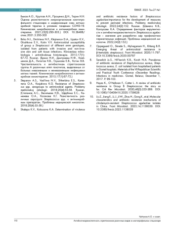 5. Степанов А.С., Васильева Н.В., Щербина Е.С., Каменева О.А., Косякова К.Г. Резистентность различных серогрупп Streptococcus spp. к антимикробным препаратам. Проблемы медицинской микологии. 2018;20(4):55-58.