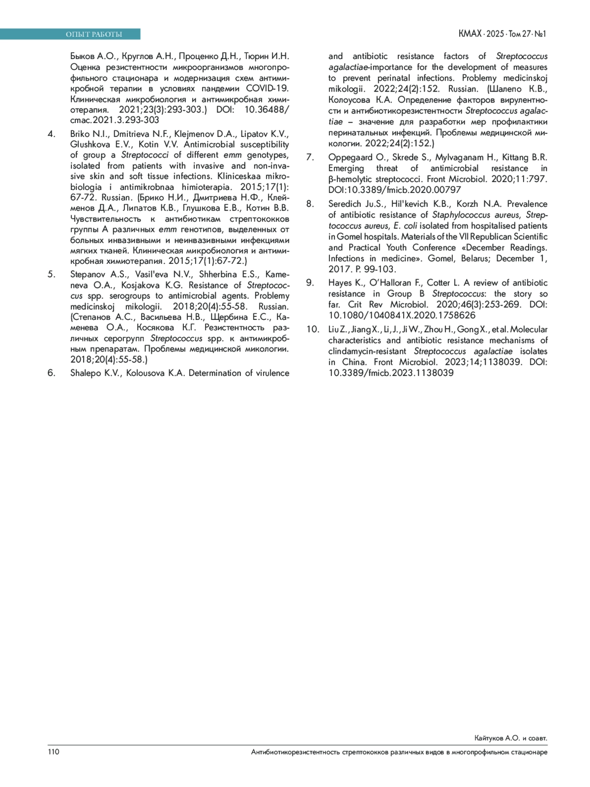 6. Шалепо К.В., Колоусова К.А. Определение факторов вирулентности и антибиотикорезистентности Streptococcus agalactiae - значение для разработки мер профилактики перинатальных инфекций. Проблемы медицинской микологии. 2022;24(2):152.