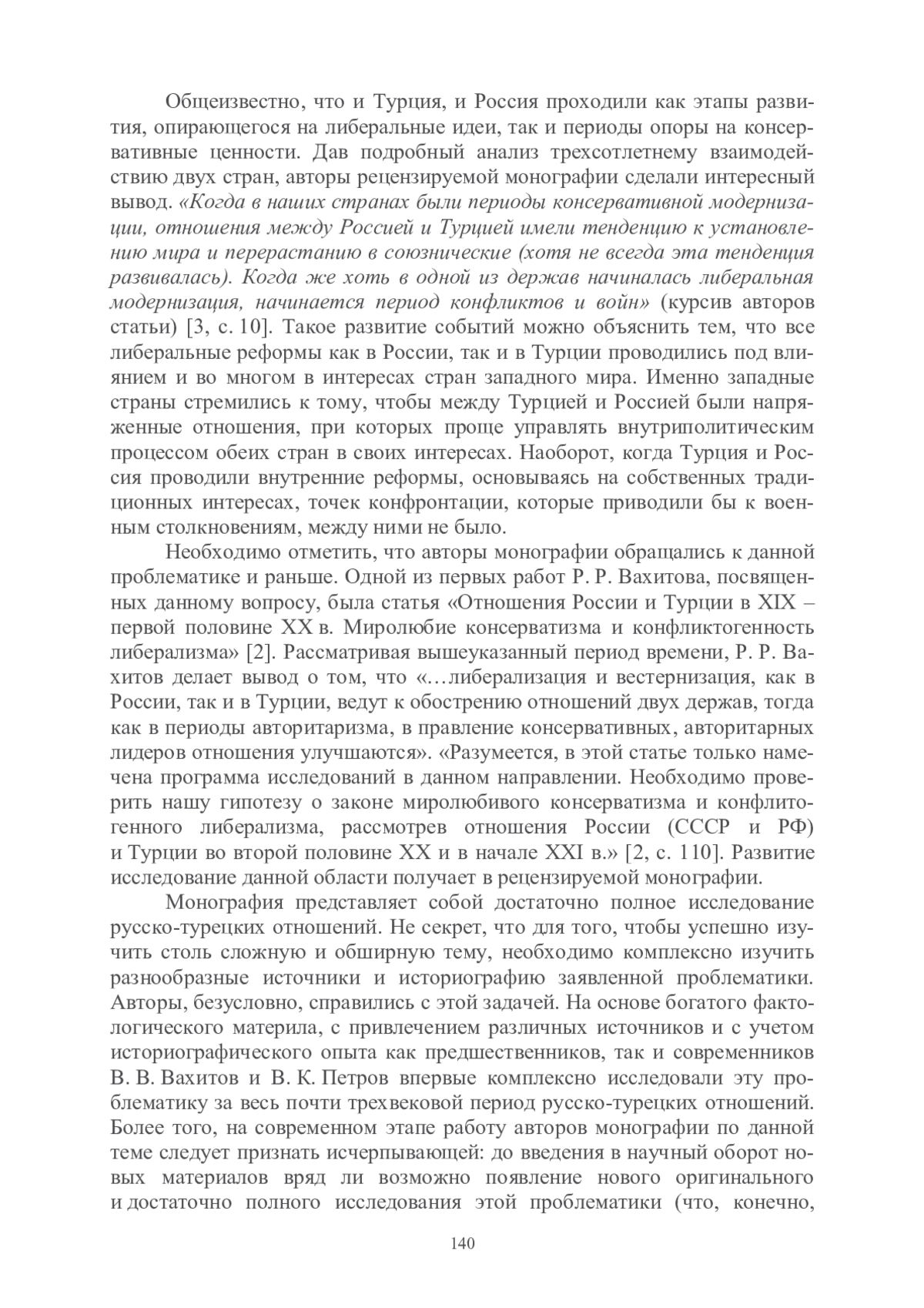 Монография Р. Р. Вахитова и В. К. Петрова «Российско-турецкие отношения в периоды консервативных и либеральных модернизаций XIX– XXI вв.» написана на важную и актуальную тему, которая наиболее востребована в настоящее время. Сегодня происходит распад глобального мира и формирование новых центров геополитического влияния. Именно такими центрами на протяжении всей своей истории были как Турция, так и Россия. Поэтому обращение к истории взаимоотношения этих стран вызывает особый интерес.