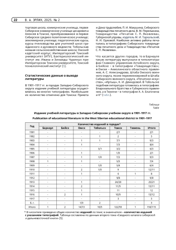 Обобщенные данные по статистике и тематике учебных и учебно-методических изданий, вышедших в типографиях Западно-Сибирского учебного округа в начале XX в., представлены впервые. Результаты проведенного статистического анализа свидетельствуют о том, что лидером в издании подобной литературы был Томск.