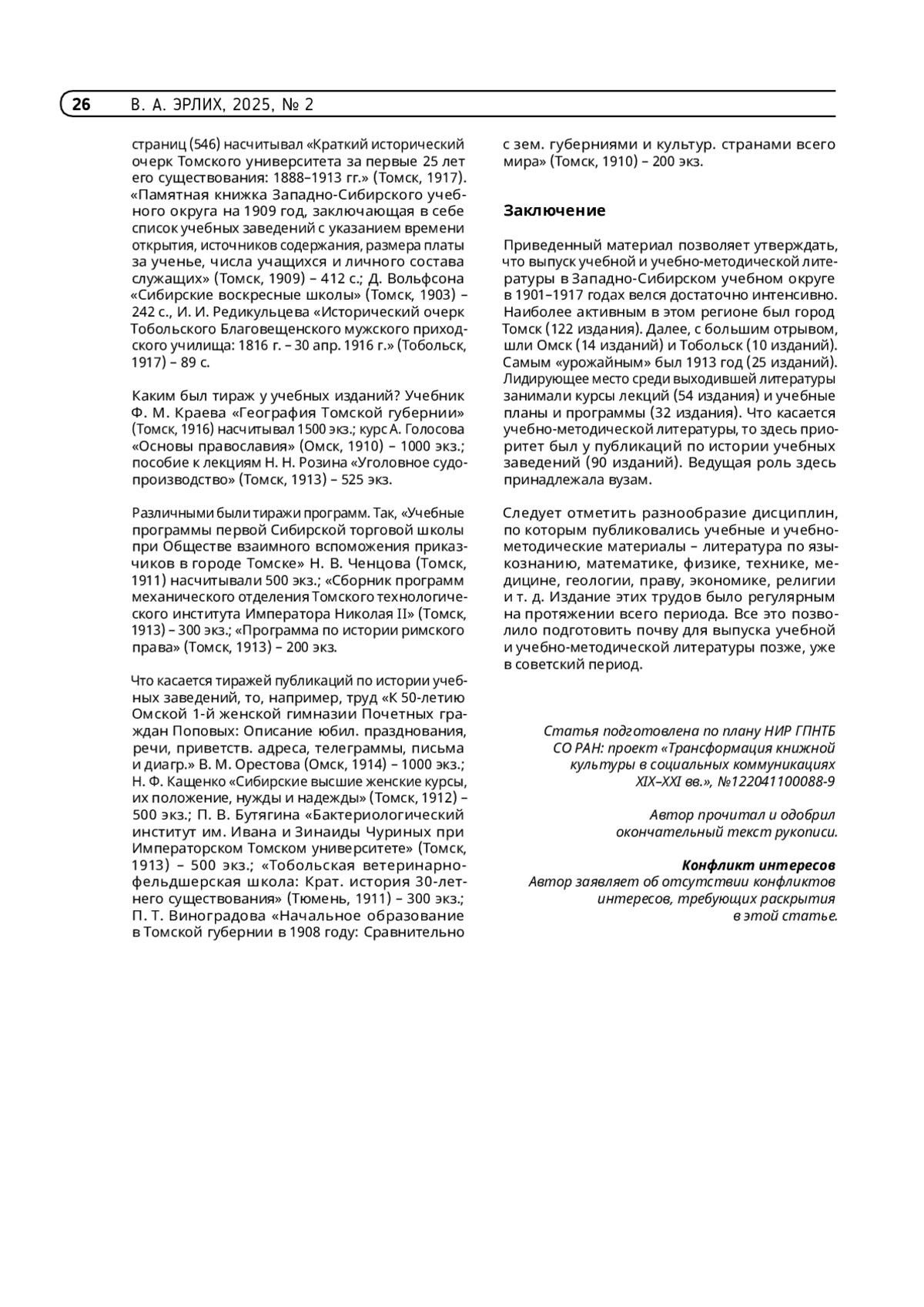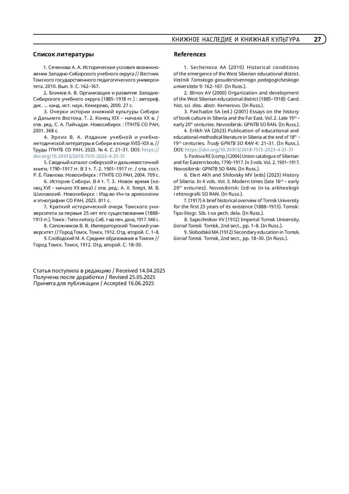 4. Эрлих В. А. Издание учебной и учебно-методической литературы в Сибири в конце XVIII-XIX в. // Труды ГПНТБ СО РАН. 2023. № 4. С. 21-31. https://doi.org/10.20913/2618-7515-2023-4-21-31