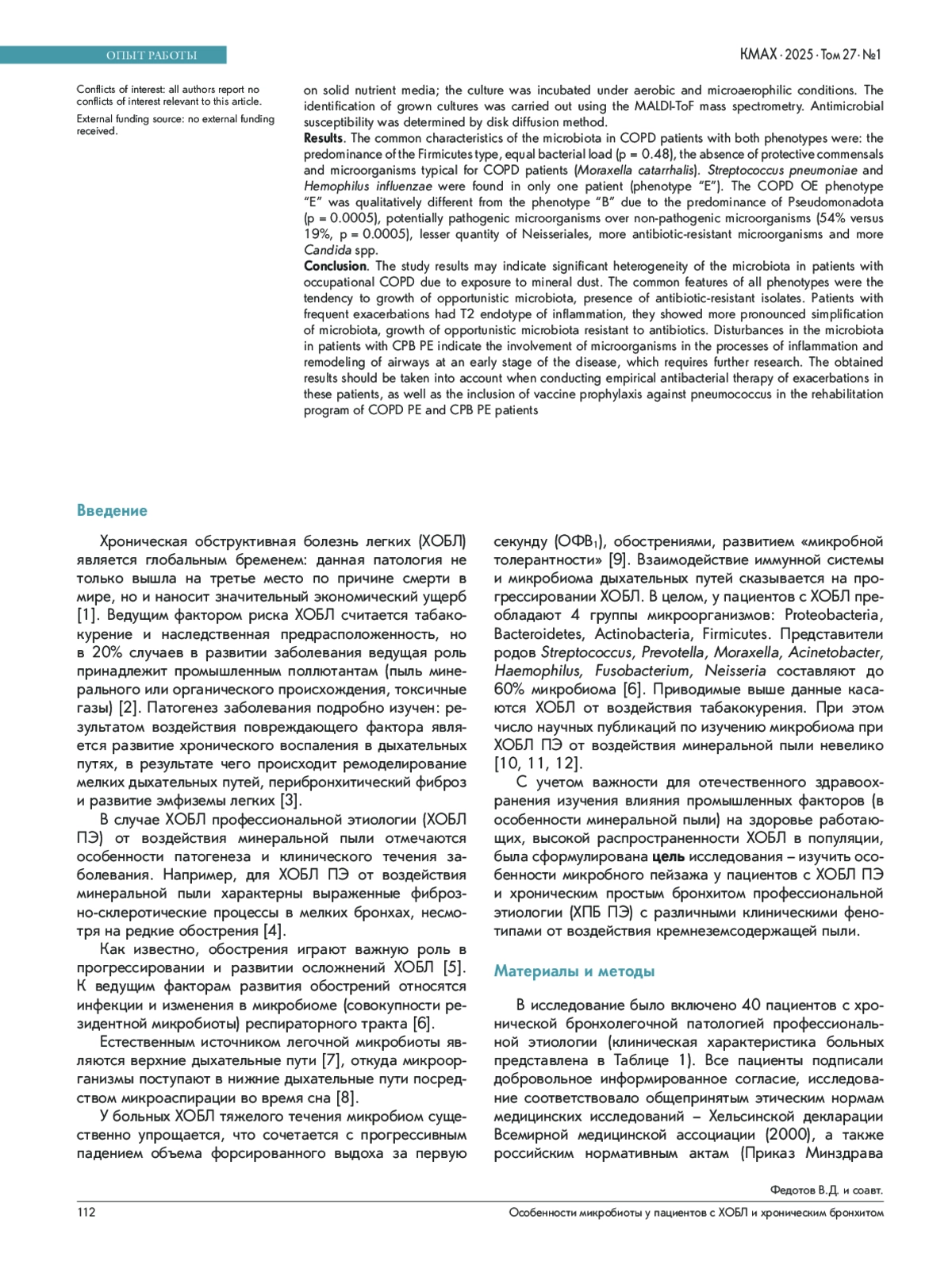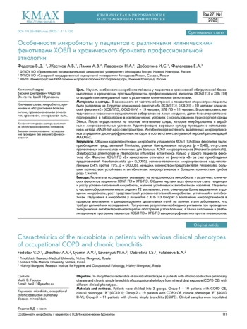 Цель. Изучить особенности микробного пейзажа у пациентов с хронической обструктивной болезнью легких и хроническим простым бронхитом профессиональной этиологии (ХОБЛ ПЭ и ХПБ ПЭ) от воздействия минеральной пыли с различными клиническими фенотипами.